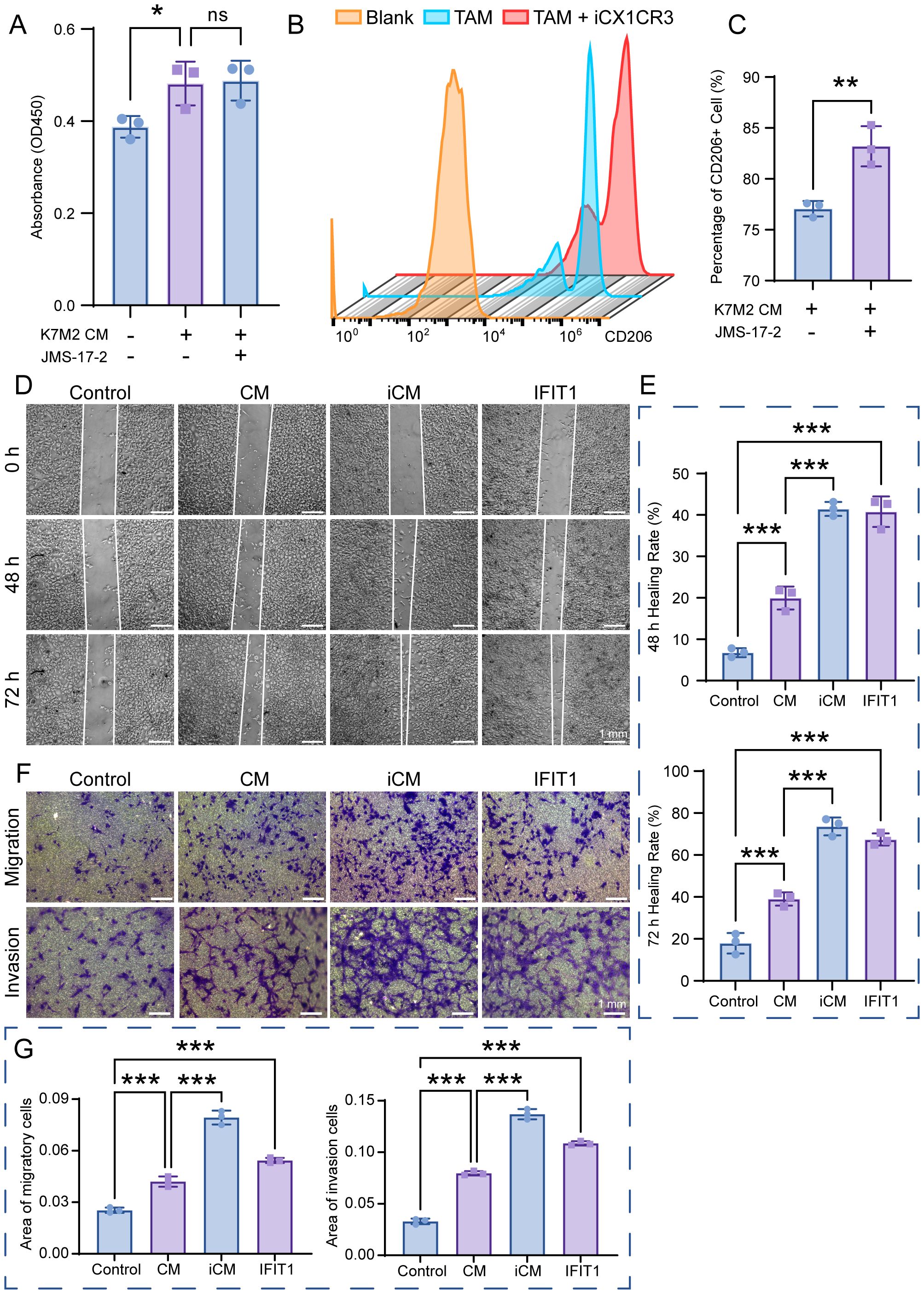 Figure 6. The function of IFIT1 and CX3CR1 in osteosarcoma (OS). (A) Cell viability of BMMs after a 48-h treatment with or without K7M2 CM and JMS-17-2, assessed by CCK-8 assay. (B, C) TAMs treated with or without JMS-17–2 for 48 h were stained with antibodies against CD206 and analyzed using flow cytometry. (D) Wound-healing assay to assess the migration capabilities of K7M2 cells. (E) Quantification of the K7M2 healing rate. (F) Transwell assay to assess the migration and invasion capabilities of K7M2 cells. (G) Quantification of migratory and invasive cell areas. * p < 0.05, ** p < 0.01, *** p < 0.001. ns, no significance, p > 0.05.
