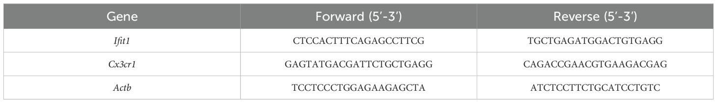 Transcript levels of Ifit1 and Cx3cr1 were quantified via SYBR green-based RT-PCR. Normalization employed endogenous β-actin, with primer sequences detailed in Table 1.