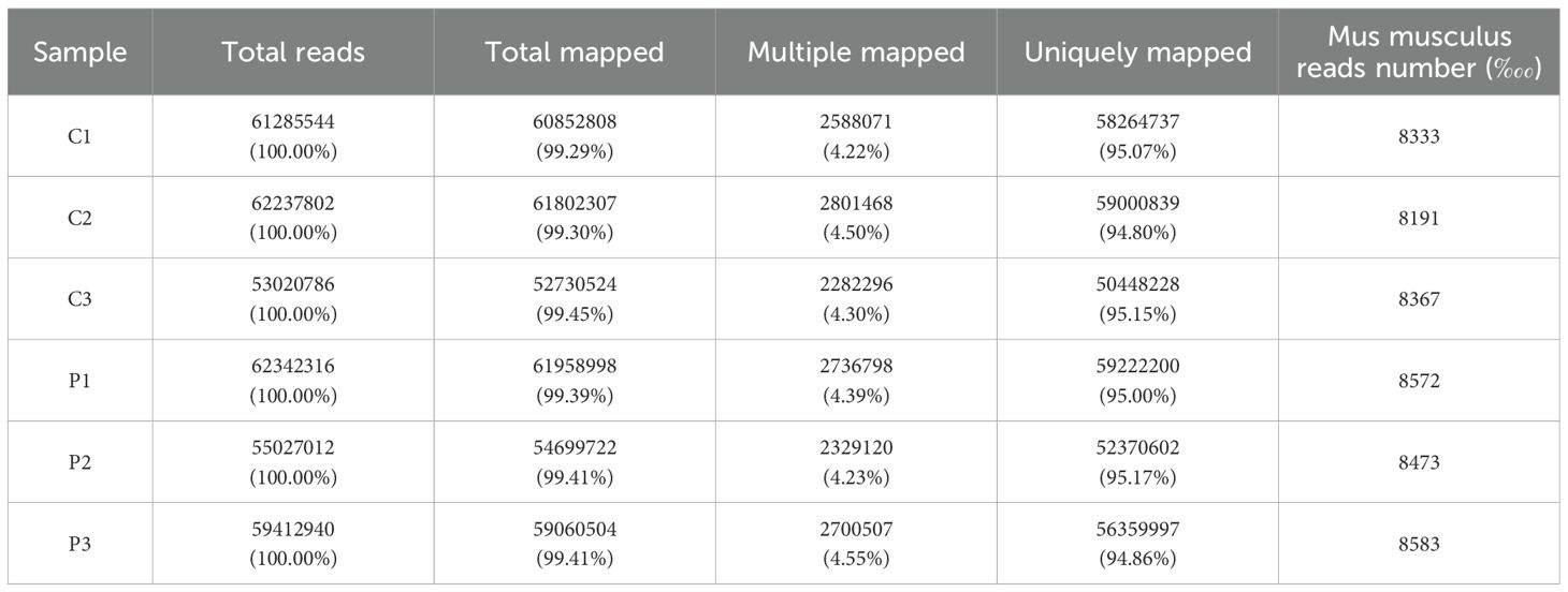 RNA-seq raw data underwent rigorous quality control. High-confidence clean reads demonstrated Q30 scores exceeding 97% across biological replicates, with genomic Guanine-Cytosine (GC) content stabilized from 51.65% to 52.39% (Table 2). Alignment to the Mus musculus reference genome achieved 99% total mapping efficiency, including 94.8% to 95.17% uniquely aligned reads (Table 3). The raw data employed in the analysis demonstrated adequate quality.