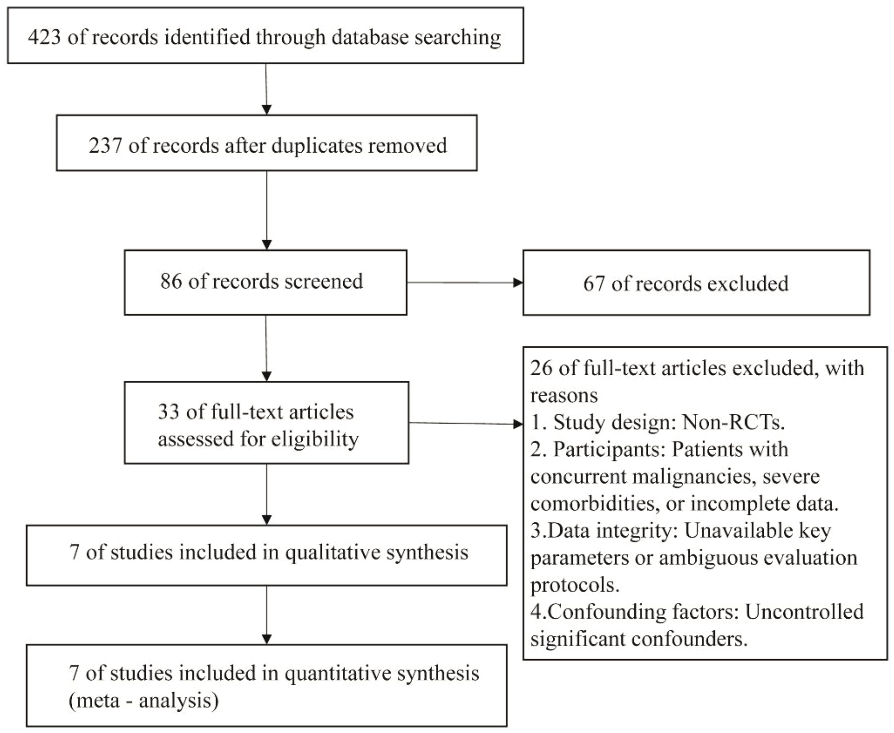 Studies with uncontrolled significant confounders, such as inconsistent treatment regimens, were excluded to minimize bias.