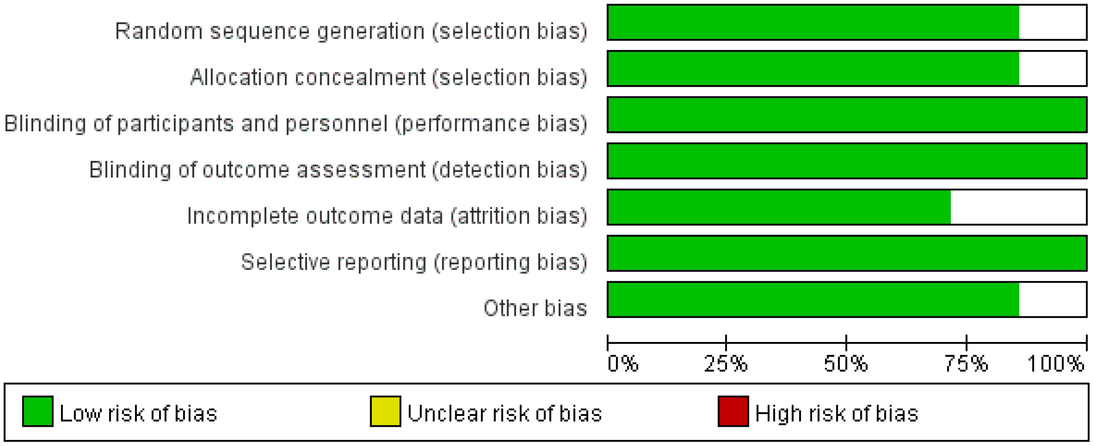 The methodological quality of included studies was evaluated using the Cochrane Risk of Bias Tool. This assessment considered the following domains: random sequence generation, allocation concealment, blinding (participants/personnel/outcome assessors), incomplete outcome data, selective reporting, and other potential sources of bias. Assessments were independently conducted by two reviewers, and any discrepancies were resolved by consensus.