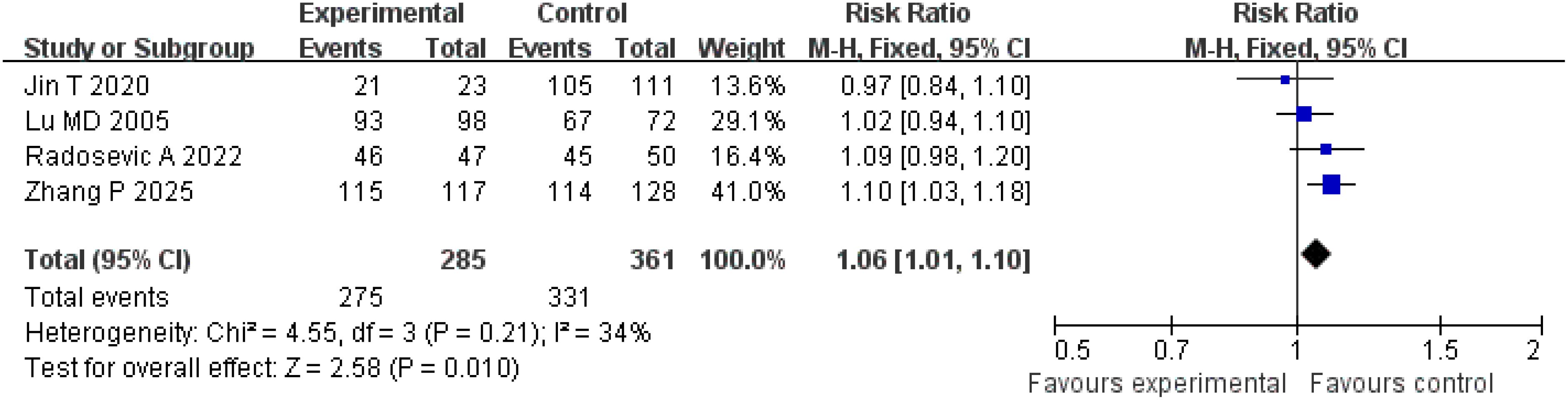 A total of four studies were included for the analysis of the complete tumor ablation rate. The Q-test and I2 test indicated low heterogeneity among the studies (p = 0.21; χ2 = 4.55; df = 3; I2 = 34%). The results demonstrated a statistically significant difference between the treatment and control groups (Z = 2.58; p = 0.010), with a pooled risk ratio (RR) of 1.06 (95% CI = [1.01, 1.10]), suggesting that the treatment group achieved superior complete tumor ablation rates compared with the control group. The funnel plot was approximately symmetric, indicating minimal publication bias (Figures 3, 4).
