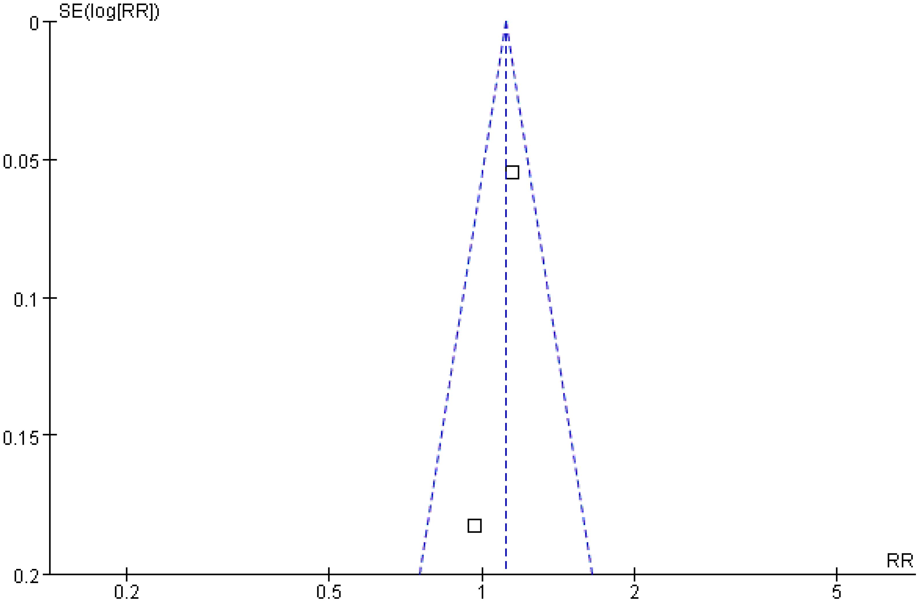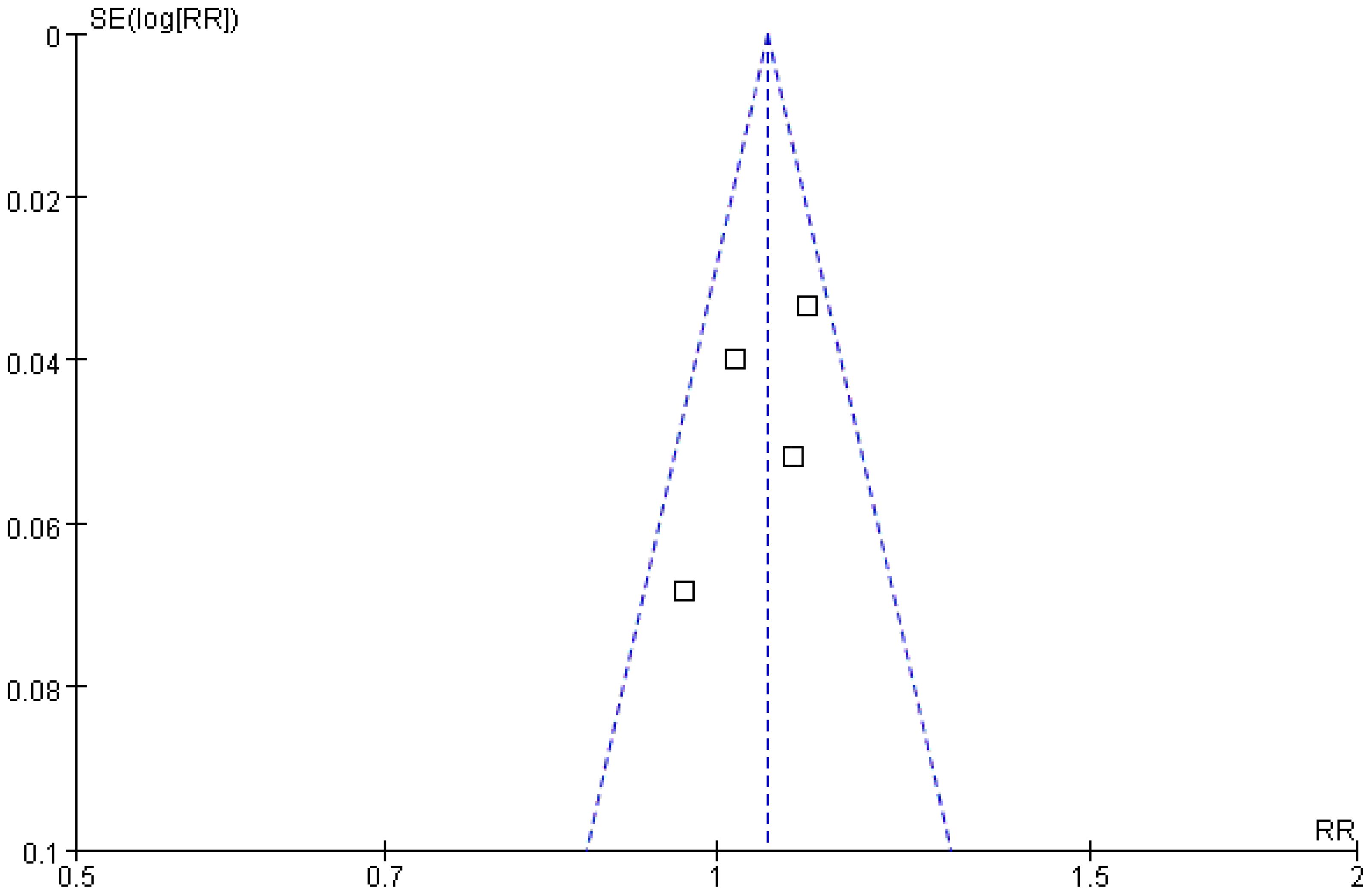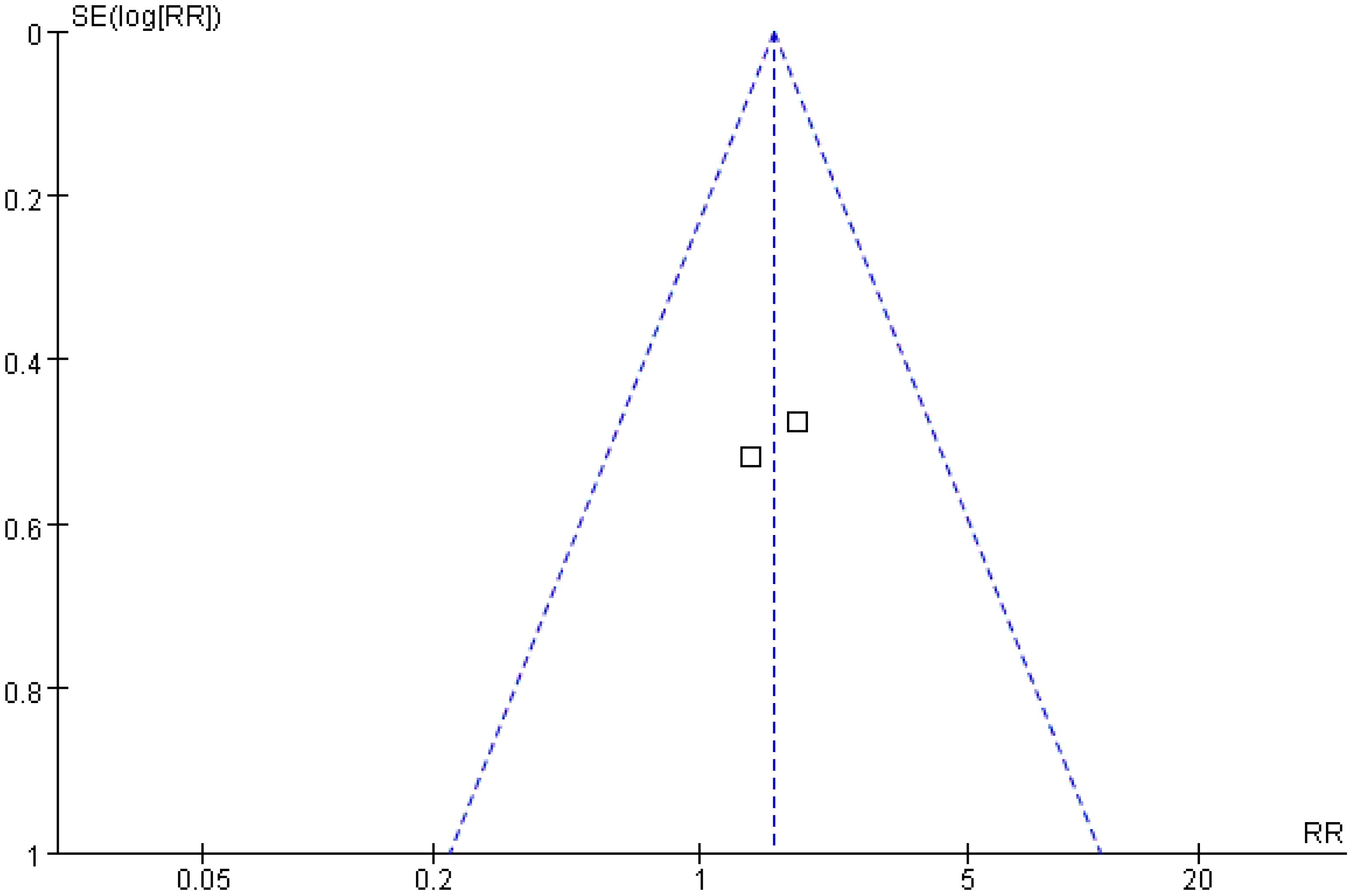 Two studies were included in the analysis of recurrence-free survival. The Q and I2 test statistics revealed no significant heterogeneity among studies (p = 0.33; χ2 = 0.95; df = 1; I2 = 0%). Pooled effect size analysis demonstrated a RR of 1.11 (95% CI = [1.00, 1.24]), indicating a positive trend favoring the treatment group, but this did not reach conventional statistical significance (p = 0.06). It is important to note that this analysis, based on only two studies, is likely underpowered to detect a clinically important difference, and the nonsignificant result may reflect a type II error. The funnel plot was approximately symmetric, indicating low publication bias (Figures 7, 8).