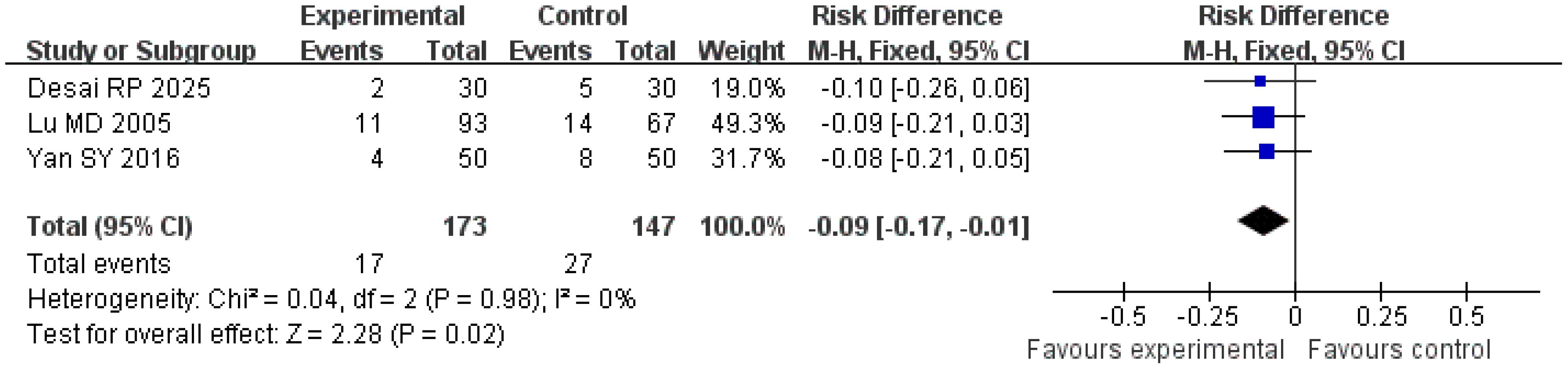 A total of three studies were included in the analysis of local recurrence rates. The Q and I2 test results (p = 0.98; χ2 = 0.04; df = 2; I2 = 0%) indicated no significant heterogeneity among the studies. Pooled effect size analysis revealed a risk difference (RD) of − 0.09 (95% CI = [− 0.17, − 0.01]), demonstrating a statistically significant difference between the two groups (Z = 2.28; p = 0.02), suggesting that the treatment group had a lower local recurrence rate compared with the control group. The funnel plot was approximately symmetric, indicating low publication bias (Figures 5, 6).