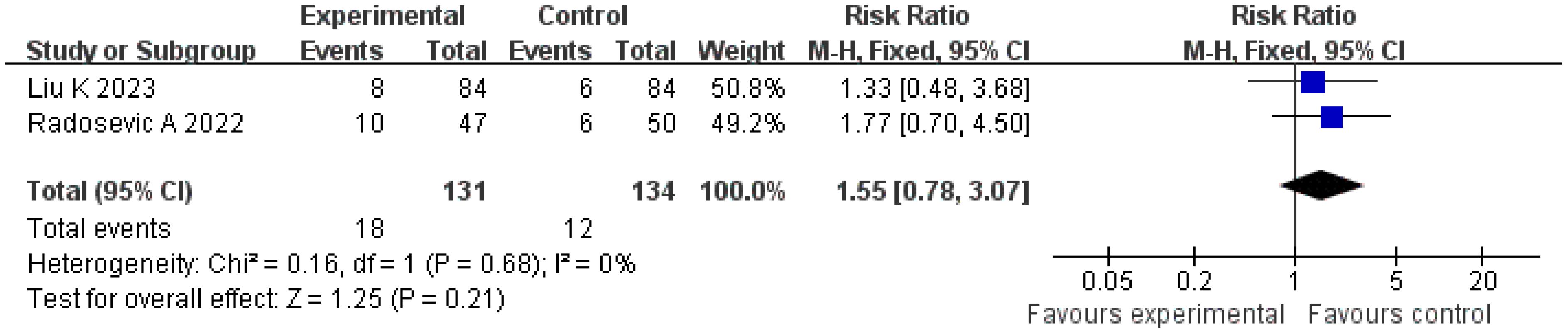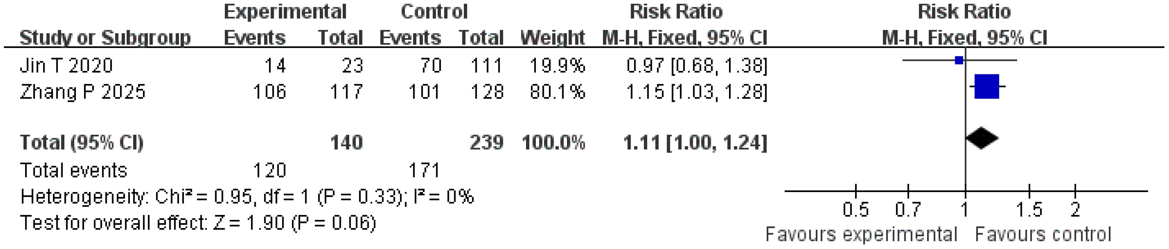 Recurrence-free survival is an important indicator reflecting the long-term prognosis of patients. An analysis of two studies involving 379 patients in the present research showed that the recurrence-free survival in the treatment group was slightly higher than in the control group (RR = 1.11; 95% CI = [1.00, 1.24]; p = 0.06). Although this observed trend toward improved recurrence-free survival (RFS; RR = 1.11; p = 0.06) was not statistically significant, it is clinically encouraging. However, this conclusion is tentative, as the analysis was underpowered; the failure to reach statistical significance likely reflects a type II error rather than conclusive evidence of no effect. Future studies with larger sample sizes and longer follow-up are needed to definitively determine the impact on long-term survival. The observed trend may be influenced by the small sample size and differences in follow-up time: the follow-up period in the study by Liu et al. was 18 months, whereas that in the study by Zhang et al. was 24 months. Variations in follow-up periods may affect the stability of the results (9, 13). In addition, the recurrence-free survival is influenced by multiple factors, including tumor stage and liver function reserve. Differences in baseline characteristics (such as Child–Pugh grade and tumor number) in the included studies may reduce the observed significance of differences between groups (23, 24). Future studies with larger sample sizes and long-term follow-up are needed to further evaluate the impact of this strategy on recurrence-free survival.