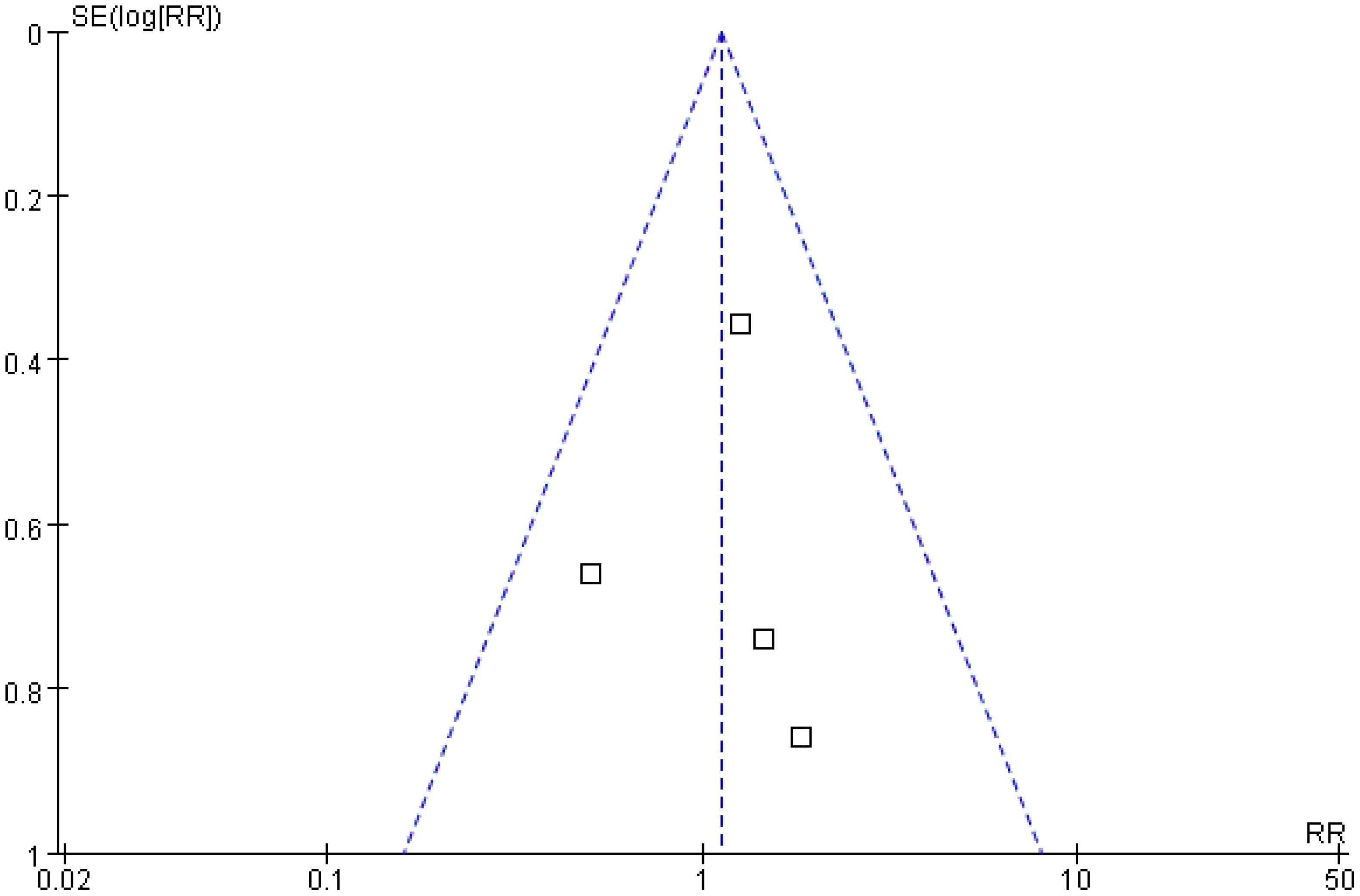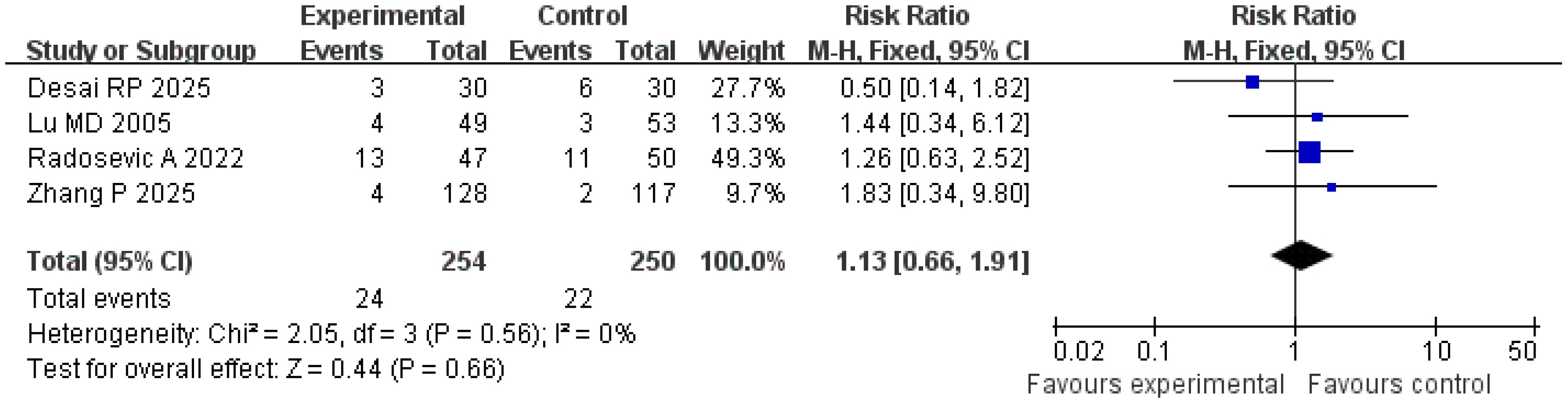 A total of four studies were included in the analysis of complication incidence. The results of the Q and I2 tests were as follows: p = 0.56 (χ2 = 2.05; df = 3), I2 = 0%, indicating no significant heterogeneity among the studies. In the pooled effect size analysis, the RR was 1.13, with a 95% CI of [0.66, 1.91]. There was no statistically significant difference between the two groups (Z = 0.44; p = 0.66). The funnel plot was approximately symmetric, suggesting a low risk of publication bias (Figures 11, 12). It is important to note that the reported complications were predominantly major adverse events. Data on minor complications (e.g., postablation syndrome, transient pain, or biochemical abnormalities) were inconsistently reported across studies, precluding their meaningful analysis.