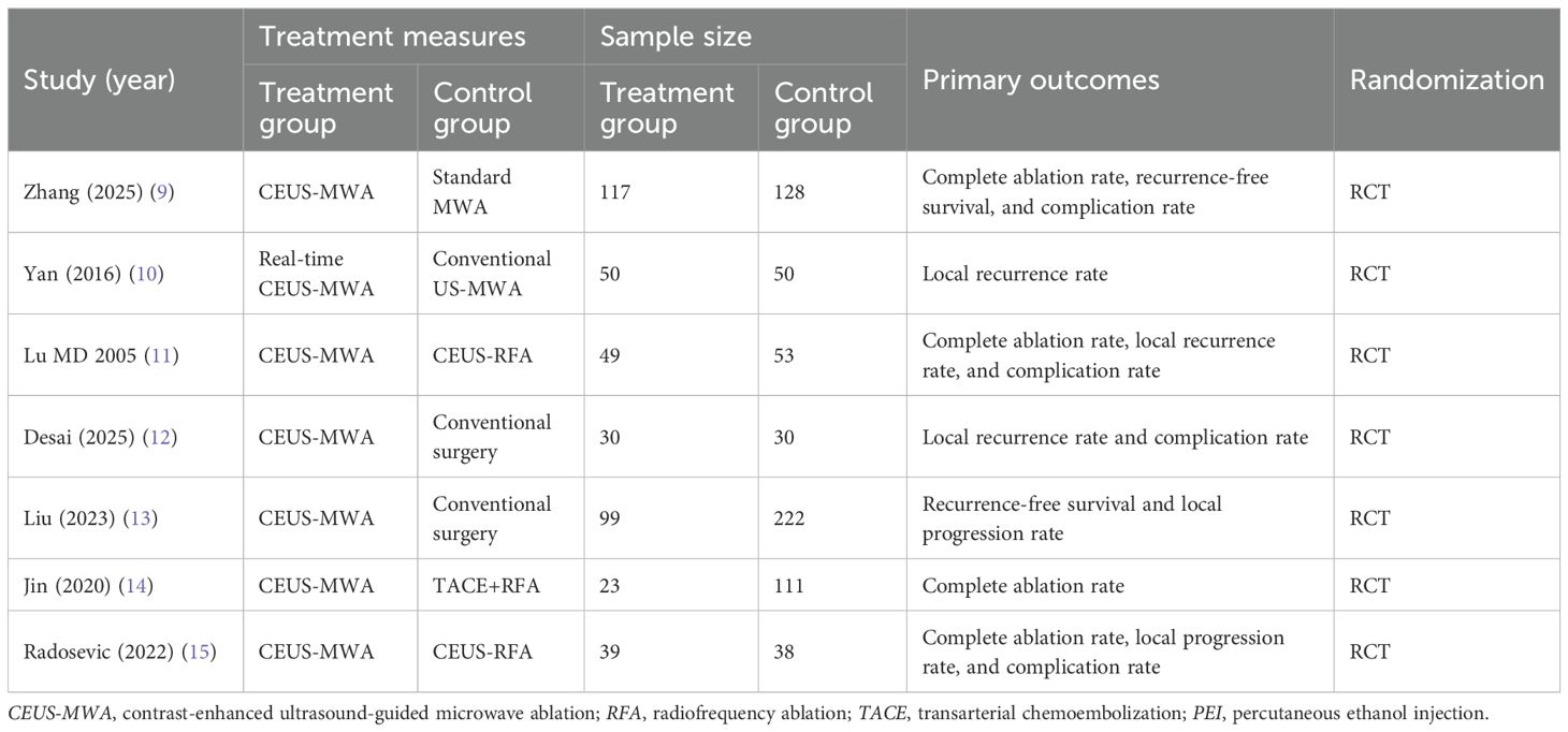 However, studies relying solely on imaging or serological markers have limitations: imaging features may fail to accurately identify microscopic residual lesions, whereas serum biomarkers are susceptible to interference from hepatic/renal function and other factors (7, 8). Although prior research has explored the combined application of these modalities, discrepancies in sample sizes and evaluation criteria have led to contentious conclusions. Therefore, this meta-analysis aims to evaluate the efficacy of a specific clinical strategy: the active integration of multiparametric data—specifically, quantifiable CEUS characteristics (e.g., hemodynamic perfusion patterns like “fast-in-fast-out”) and key serum biomarkers (e.g., AFP and DCP)—into the procedural planning and execution of CEUS-guided MWA for HCC. Unlike prognostic studies that merely assess correlations, our objective is to determine whether clinically acting upon this combined information leads to superior outcomes compared with a control strategy that does not formally integrate such data. This systematic review of RCTs is designed to provide the most robust evidence regarding the causal benefit of this integrated guidance strategy, and its findings hold significant clinical implications for advancing precision ablation therapy.
