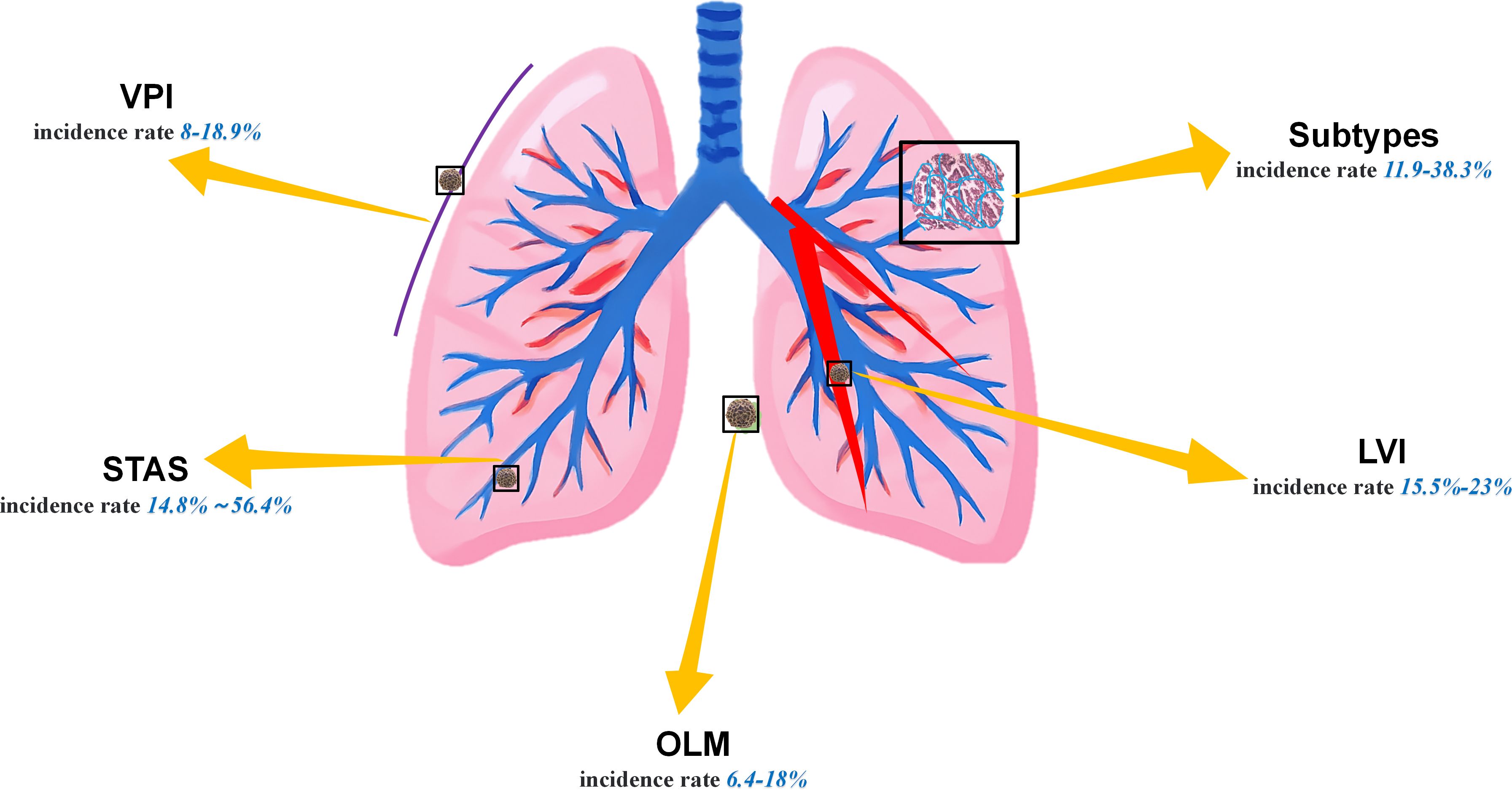 Lung cancer remains the leading cause of cancer-related mortality worldwide. Lung adenocarcinoma (LUAD), accounting for over 50% of newly diagnosed lung cancer cases (1, 2), is particularly prevalent. Although surgical resection, as the standard treatment, has significantly improved the prognosis of patients with early-stage LUAD, specific pathological risk factors still contribute to recurrence in certain patients. The currently widely recognized LUAD pathological risk factors primarily include spreading through air spaces (STAS), visceral pleural invasion (VPI), lymphovascular invasion (LVI), occult lymph node metastasis (OLM), and presence of micropapillary and solid subtypes (Figure 1) (3, 4). Owing to the presence of these high-risk factors, some subtypes of adenocarcinoma exhibit greater aggressiveness. Although the specific mechanisms remain unclear, the factors may be associated with higher tumor mutation burdens or the presence of microscopic tumor residues (5, 6). Simultaneously, the disruption of intercellular adhesion complexes in the lungs exacerbates the invasive spread of tumors (7). More critically, STAS and subtypes such as micropapillary or solid subtypes often coexist. Patients with a larger number of concomitant high-risk factors are more prone to recurrence and exhibit poorer long-term survival rates (4, 8–10). For such patients, lobectomy with radical lymph node dissection is recommended over segmentectomy (11). Unfortunately, it is not possible to diagnose these factors by visually examining computed tomography (CT) images (12), and invasive preoperative procedures such as bronchoscopy or percutaneous transthoracic needle biopsy (PTNB) may cause harm to patients and offer low sensitivity. Therefore, how to effectively enhance the accuracy of screening for LUAD risk factors through noninvasive methods before surgery, reduce the rate of missed diagnoses, and alleviate the workload of clinicians have become an urgent issue requiring resolution nowadays.
