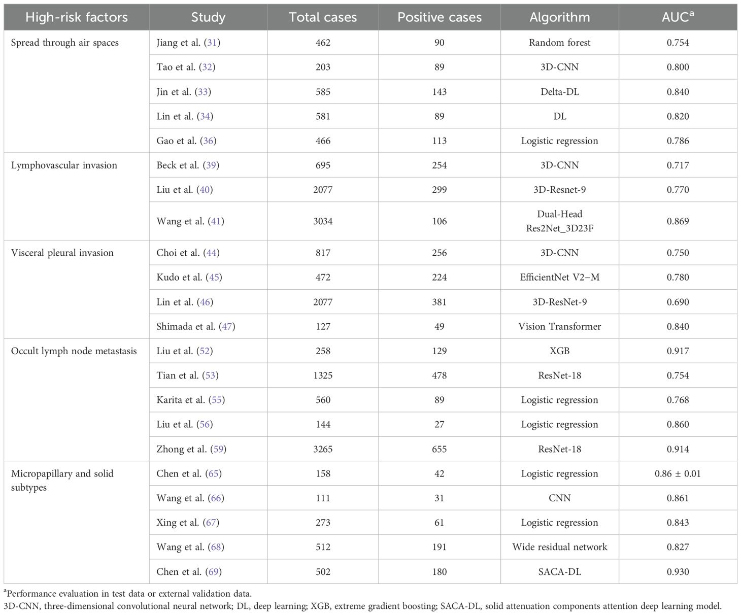 During the development of LUAD, various growth patterns (including squamous, acinar, micropapillary, and solid types) occur. Generally, various pathological subtypes are calculated in increments of 5%, and the proportion of the main subtypes determines the dominance of the pathological types (3). We focused on the micropapillary subtypes and solid types in LUAD, which are closely related to DFS and OS after surgery (61) and accompanied by a higher postoperative recurrence rate (9, 62). More researchers are exploring the application of DL techniques in predicting LUAD pathotypes due to DL detection of details that cannot be observed by the human eye (63). Dong et al. developed two deep learning models based on LeNet and DenseNet, discovering that deep learning techniques can not only be applied to the classification of invasive LUAD but also used to predict micropapillary patterns—marking the first attempt at utilizing deep learning technology in this field (64). Chang et al. used an advanced LUAD subtype detection algorithm to analyze near-pure lung adenocarcinoma imaging with histological features and plaque images and obtained high sensitivity and moderate specificity (65). As intratumoral heterogeneity is manifested in the pathological components and tumor imaging features, a single modality may not be able to accurately identify the solid components within the tumor (66–68). Thus, the establishment of a comprehensive model combining DL-based scoring and clinical imaging features to distinguish LUAD with micropapillary and solid-type structure enhanced the classification performance (68). Chen et al. developed a DL model based on the data of 502 patients with pathologically diagnosed high-grade adenocarcinoma within 4 years. They applied a solid-attenuation-component-like subregion masks (tumor area ≥-190 HU) to guide the DL model in analyzing high-grade subtypes. This is another promising preoperative prediction method for high-grade adenocarcinoma subtypes (69). Similar to the assessment of other high-risk factors, 18F-FDG PET/CT data are increasingly being applied to DL because of the high metabolic rate of tumor cells and have demonstrated decent predictive accuracy for microscopic or solid components within LUAD (70, 71). A new study demonstrated the combined DL of texture features for ultra-short echo time MRI (UTE-MRI) to avoid radiation exposure while maintaining comparable diagnostic performance with CT for subtypes such as micropapillary (AUC = 0.82 vs. 0.79) (72). Despite the small sample size of the study (74 lesions), this implies the feasibility of the UTE-MRI DL model with the significant advantage of UTE-MRI in avoiding radiation hazards, especially for patients requiring multiple follow-up visits over time and for children with radiation sensitivity. Furthermore, various imaging examinations and large models that integrate imaging and genomics are providing new perspectives and tools for personalized treatment and surgical decisions. Both clinical and quantitative radiomics features, along with DL-based scoring models, can decode LUAD phenotypes. However, a notable issue arises: LUAD with multiple subtypes may exhibit mixed subtype characteristics rather than distinct information from the three subtypes, potentially limiting the discriminative capability of AI processing. Most studies rely on quantitative analysis of specific subtypes using thresholds such as 5%, 10%, or 20%. Future DL models and related fusion models require a more detailed stratified analysis beyond qualitative predictions (Table1).