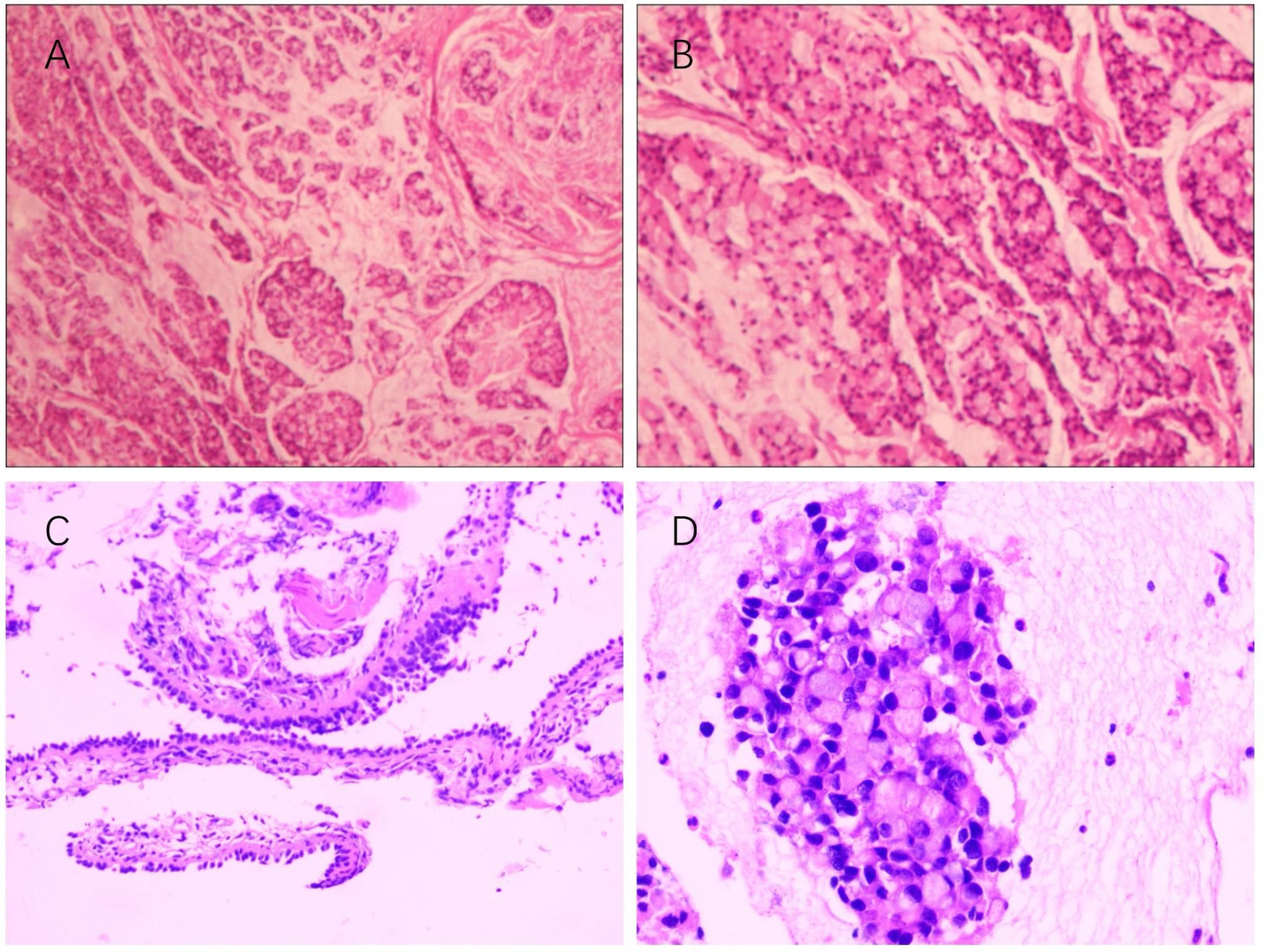 Figure 1. (A, B) Histopathological features of the primary tumor (surgical resection specimen, 2020). Hematoxylin and eosin staining; magnification ×10 and ×20. (C, D) Histopathological features of the metastatic site (Station 11R lymph node, 2025). Hematoxylin and eosin staining; magnification ×100 and ×400.