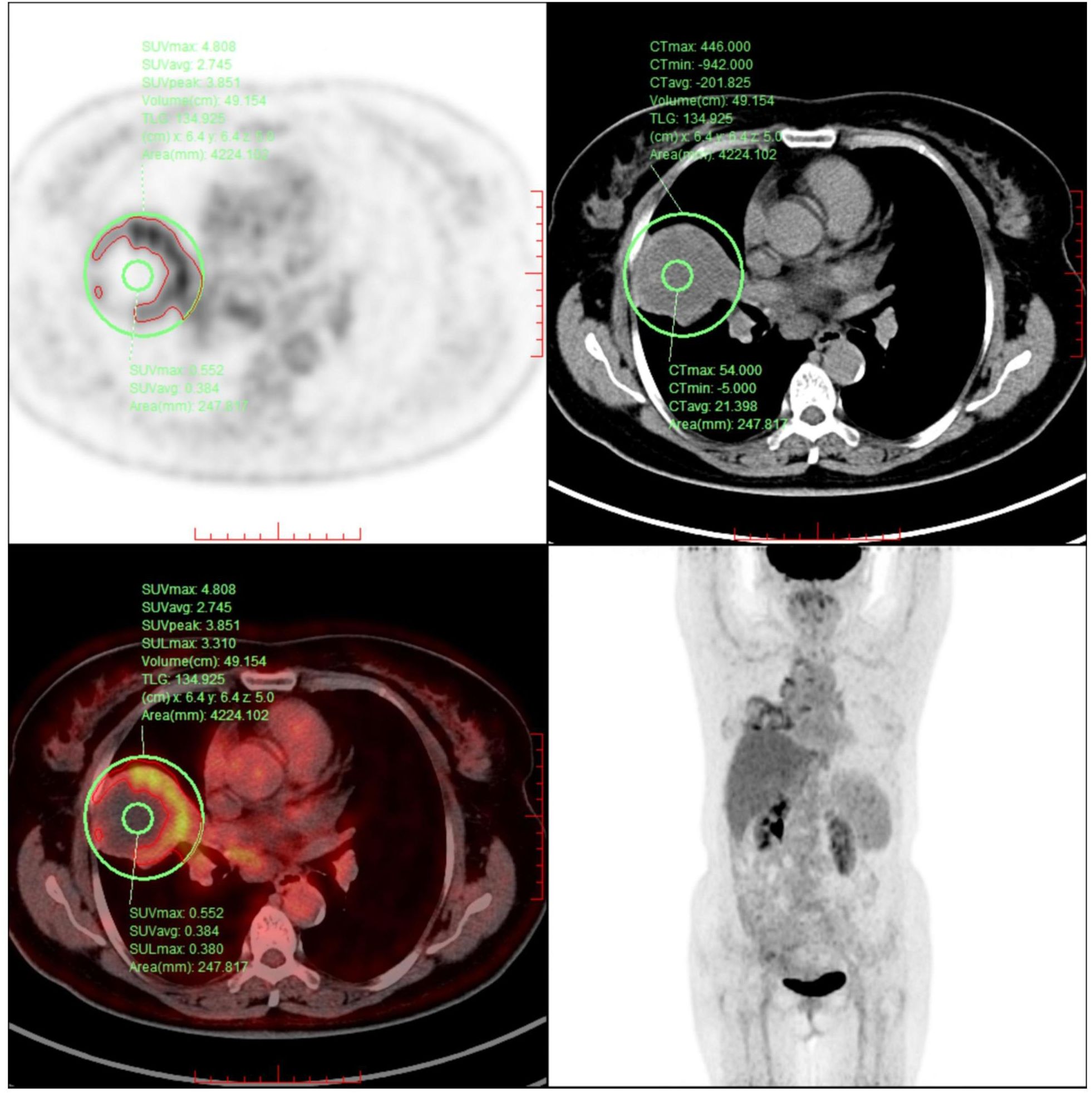 On April 5, 2025, after three cycles of chemotherapy plus targeted therapy, the patient developed grade 4 bone marrow suppression (Common Terminology Criteria for Adverse Events, version 5.0; CTCAE v5.0), with a platelet nadir of 24 × 109/L. Management included recombinant human thrombopoietin (rhTPO) and platelet transfusions, resulting in hematologic recovery. Subsequently, the patient chose to discontinue anticancer therapy. One month after completion of treatment, CA72-4 levels had decreased to 48.02 U/mL. A follow-up 18F FDG PET-CT scan on May 7, 2025, indicated stable disease (SD) according to Response Evaluation Criteria in Solid Tumours version 1.1 (RECIST 1.1). However, a reduction in the SUVmax of the tumor lesions was noted compared with baseline. Increased FDG uptake was noted in a segment of the esophagus (Figure 4). Upper gastrointestinal endoscopy confirmed an ulcer 22 cm from the incisors (CTCAE grade 3, v5.0). Since admission, the patient’s cough and chest tightness caused by the tumor had improved significantly. October 25,2025, the patient remains under follow-up.
