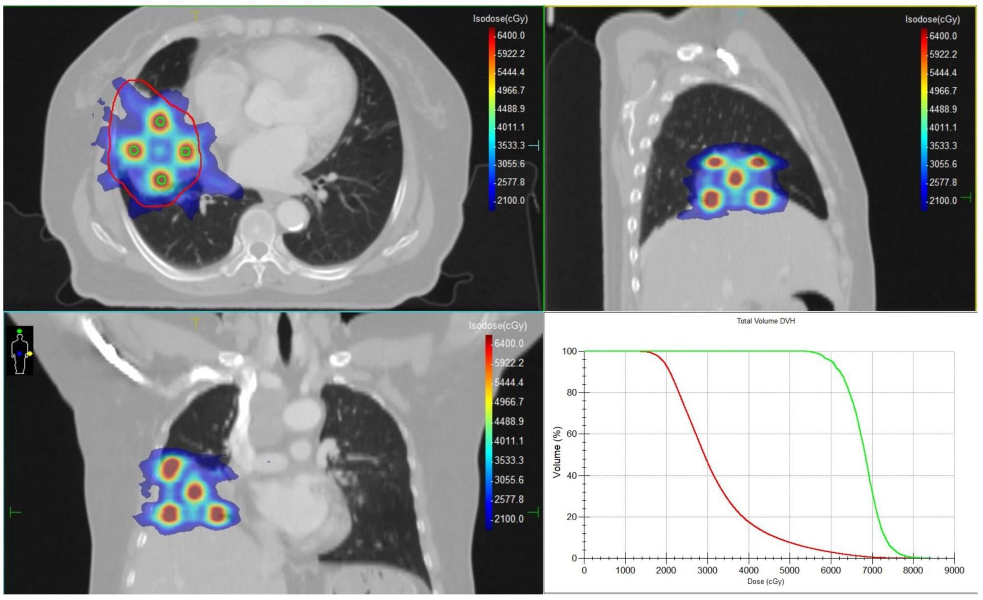 Figure 3. The target volumes and dose distribution of the SFRT, and the dose-volume histograms (DVHs) for GTV and GTV-peak. The red contour represents the GTV, and the green contour represents the GTV-peak.