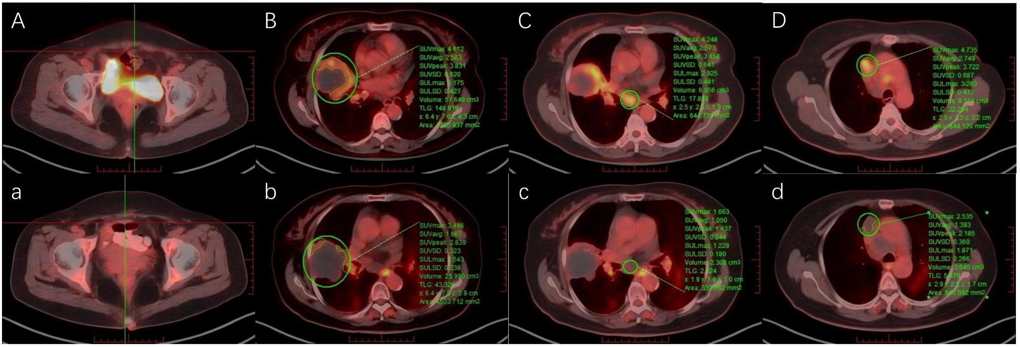 Figure 4. Pre-treatment and post-treatment 18F-FDG PET-CT images of (A, a) the surgical site, (B, b) the right lung lesion, (C, c) mediastinal lymph nodes in station 7, and (D, d) mediastinal lymph nodes in station 3.