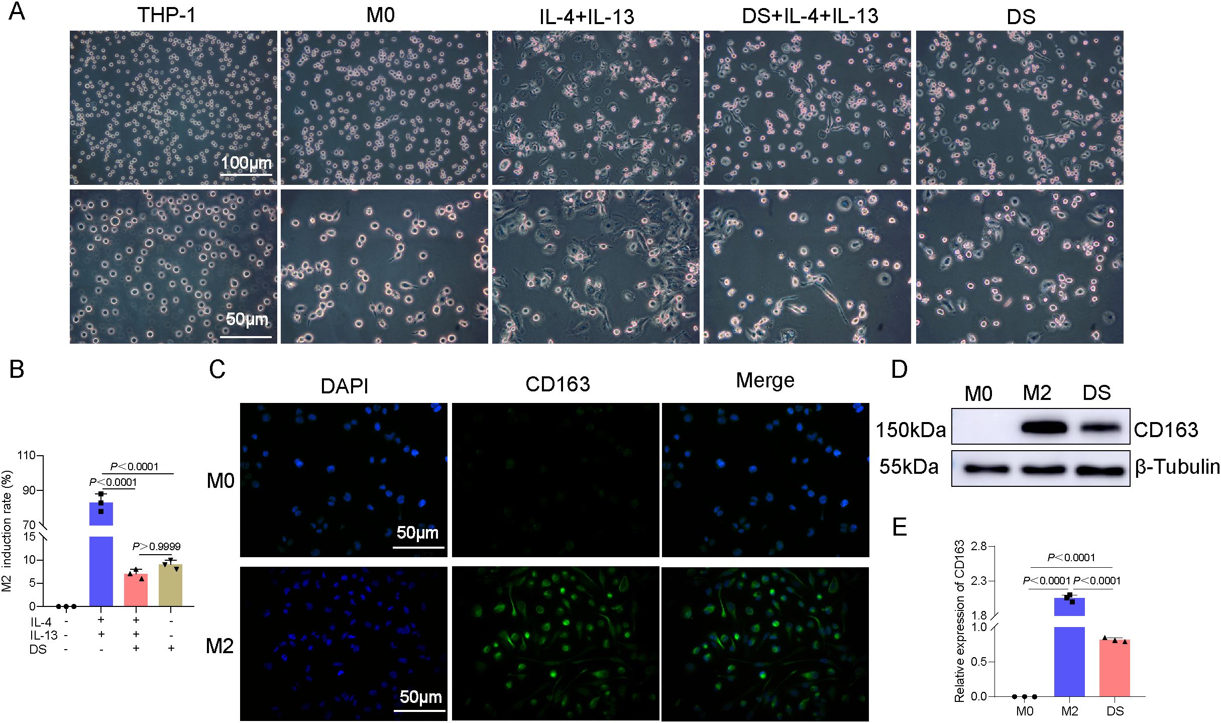 Uninduced THP-1 cells exhibited a spherical morphology. PMA (48 h) induced adherence, cell enlargement, pseudopodia extension, and an M0 macrophage morphology (irregular shape). M0-to-M2 polarization via IL-4/IL-13 (36 h) further increased the cell size, yielding elongated/polygonal cells with extended pseudopodia. Compared with IL-4/IL-13 alone, DS co-treatment (with IL-4/IL-13) or M0-stage DS exposure markedly inhibited the M2 morphology (Figure 1A) and reduced its induction rates. Compared with DS+IL-4/IL-13, DS alone did not significantly differ (Figure 1B). Cellular immunofluorescence was used for phenotypic identification, and the results revealed that CD163 effectively produced M2-type macrophages that exhibited green fluorescence under a microscope, with the fluorescence being distributed mostly in the cytoplasm and the cytomembrane. The expression of the M2-specific phenotype CD163 was greater than that of the M0 phenotype, suggesting that M2-type macrophages were successfully differentiated by induction (Figure 1C). After 36 h of treatment, Western blotting was performed to compare the expression of the M2-specific marker CD163 between two groups: the M2 group (M0 macrophages treated with IL-4 and IL-13) and the DS group (M0 macrophages co-treated with IL-4, IL-13, and DS). Compared with the M0 group, the M2 and DS groups presented significantly higher levels of CD163 protein expression, with the CD163 protein expression being markedly higher in the M2 group than in the DS group (Figures 1D, E). The above data indicate that the CD163 expression was elevated in the effectively produced M2-type macrophages and that DS was able to block the polarization of M0 toward M2.