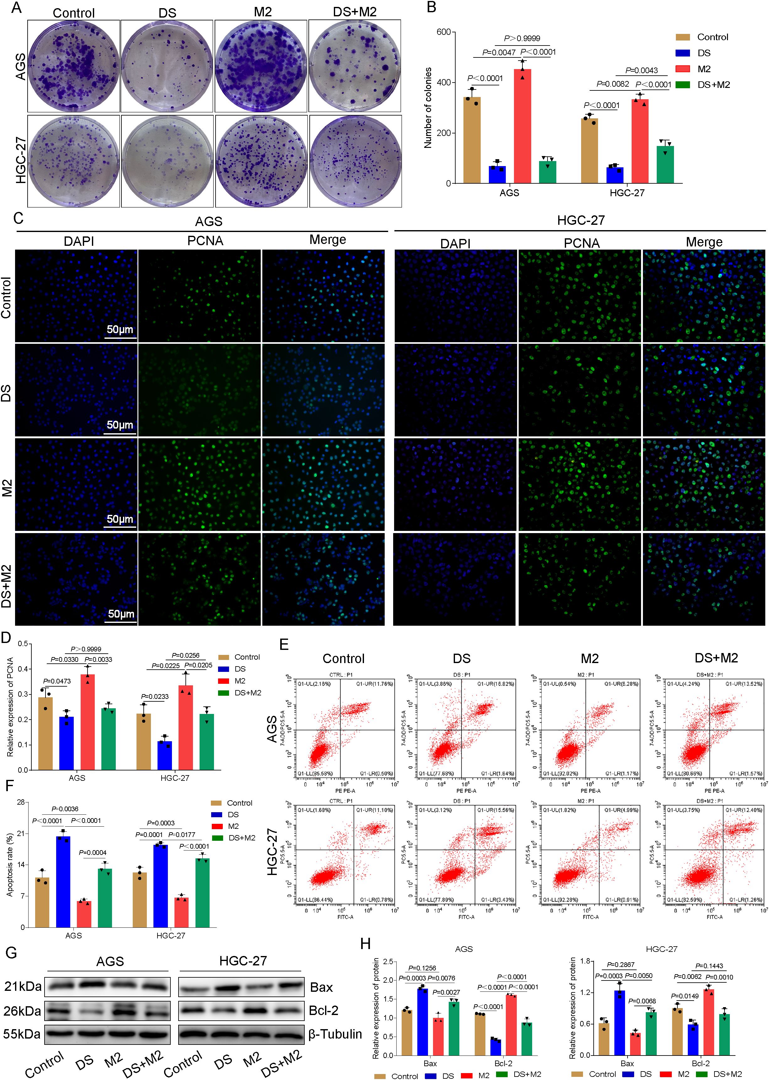 Figure 2. Dextran sulfate (DS) affects the proliferation and apoptotic ability of AGS and HGC-27 cells by acting on the polarization of M2 tumor-associated macrophages (M2-TAMs). (A) Plate seeding for the colony formation assay in two cell lines. (B) Number of colonies in two cell lines. (C) Representative immunofluorescence images of two cell lines after DS treatment. Scale bar, 50 μm. (D) Relative expression of proliferating cell nuclear antigen (PCNA). (E) Flow cytometry analysis of two cell lines. (F) Quantitative analysis of the apoptotic rate in two cell lines. (G) Western blot bands showing cell proliferation and apoptosis in AGS and HGC-27 cultures treated with DS, M2, and their combination (DS+M2). (H) Quantitative analysis of the Western blot results. Data are presented as the mean ± SEM, and exact p-values are shown in the figure panels.