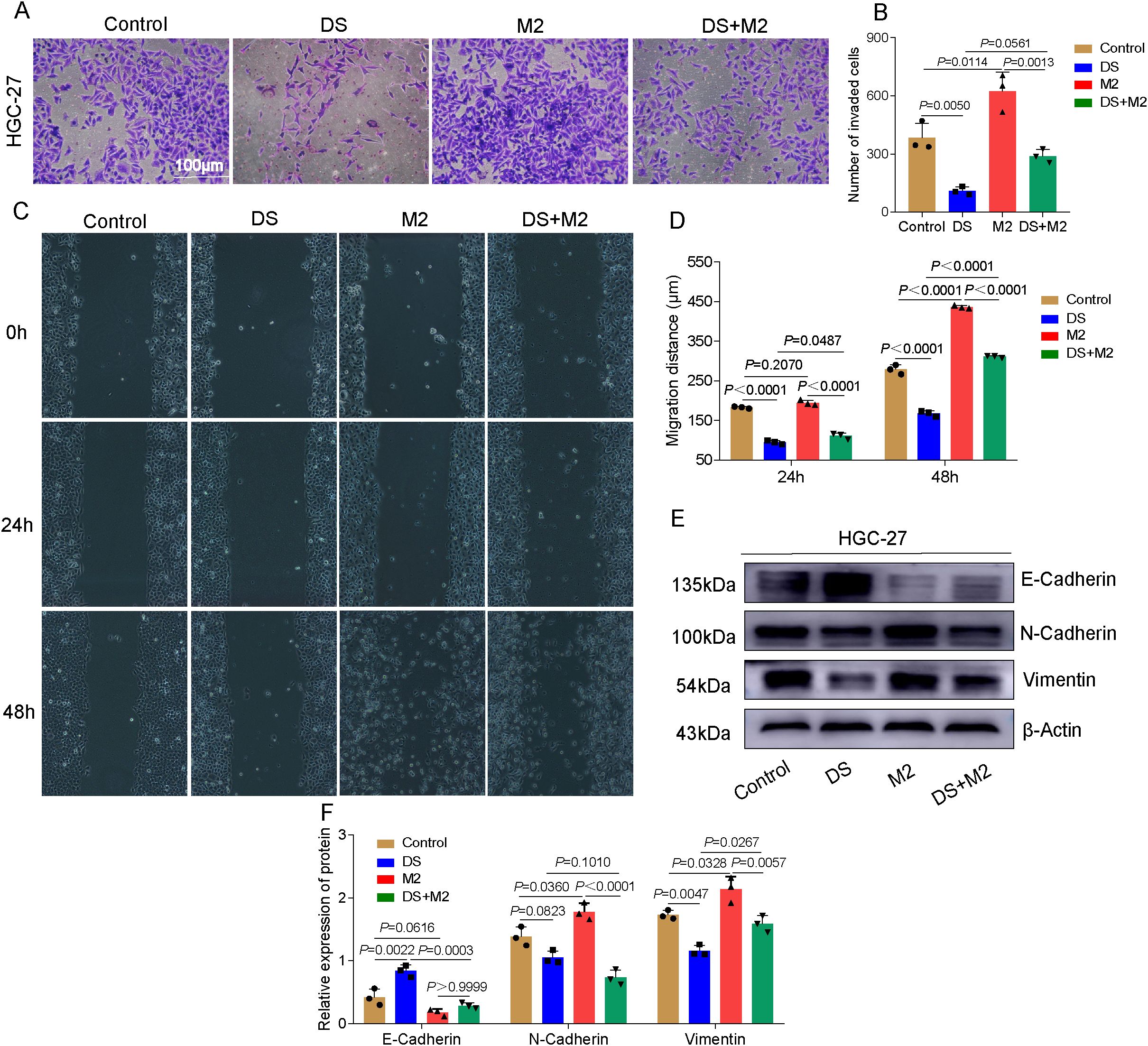 Figure 3. Dextran sulfate (DS) reduces the capacity of HGC-27 to invade and migrate via altering the polarization of M2 tumor-associated macrophages (M2-TAMs). (A) Representative images of the Transwell invasion assay in HGC-27 cells. Scale bar, 100 μm. (B) Quantitative analysis of the number of invaded cells among different groups. (C) Representative images of the wound healing assay. (D) Quantitative analysis of the migration distance among different groups. (E) Western blot bands showing the invasiveness of HGC-27 cells as a function of exposure to DS, M2, and their combination (DS+M2). (F) Quantitative analysis of the Western blot. Data are presented as the mean ± SEM, and exact p-values are shown in the figure panels.