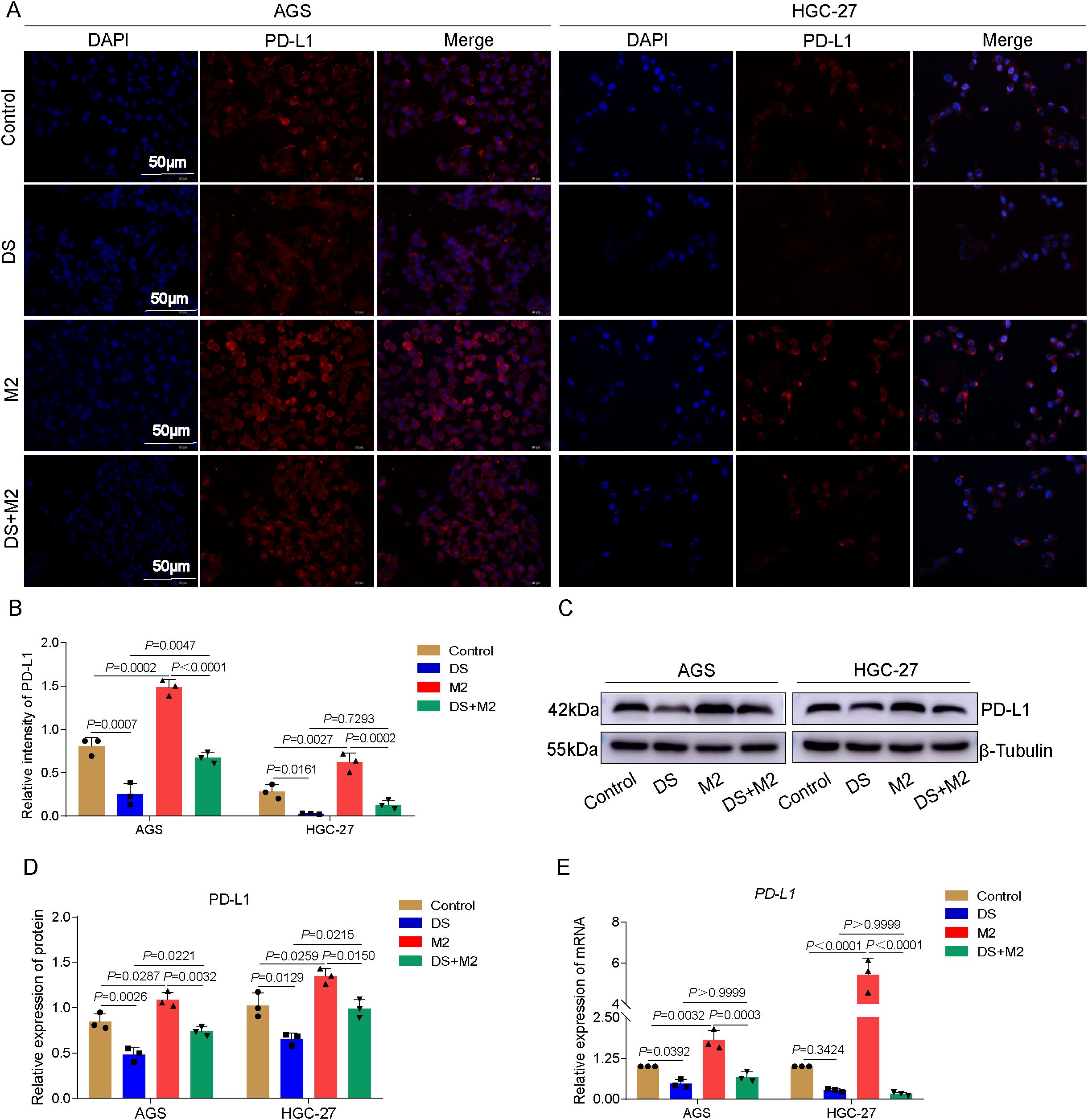 Figure 4. Dextran sulfate (DS) inhibits the expression of programmed death-ligand 1 (PD-L1) in AGS and HGC-27 cells through modulating the polarization of M2 tumor-associated macrophages (M2-TAMs). (A) Representative immunofluorescence images of two cell lines. Scale bar, 50 μm. (B) Quantitative analysis of the relative PD-L1 intensity in two cell lines. (C) Representative Western blot of PD-L1 protein expression induced by DS, M2, and their combination (DS+M2) in AGS and HGC-27 cells. (D) Quantitative analysis of the Western blot. (E) qRT-PCR analysis of PD-L1 mRNA expression induced by the same treatments in AGS and HGC-27 cells. Data are presented as the mean ± SEM, and exact p-values are shown in the figure panels.