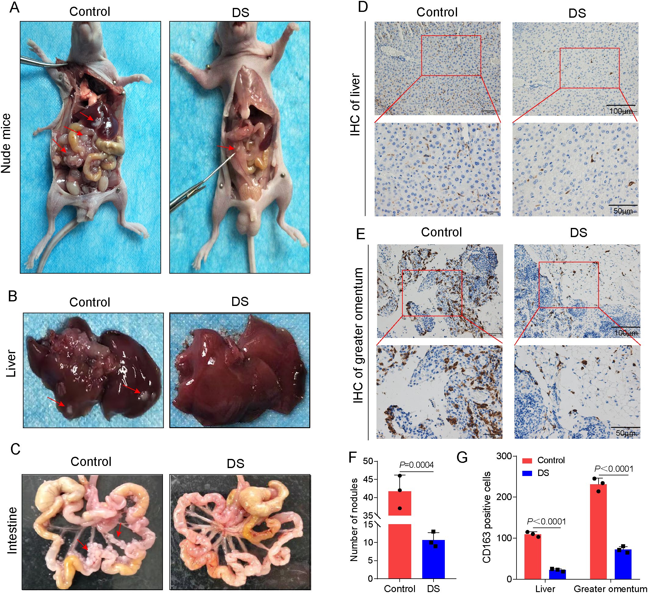 Figure 5. Effect of dextran sulfate (DS) on human gastric cancer cells (HGCCs) with intraperitoneal implantation metastasis. (A) Gross appearance of the peritoneal tumor nodules in nude mice. (B) Gross histopathological changes in the liver. (C) Gross morphological changes in the intestine. (D) Representative immunohistochemical images of the liver tissue. (E) Representative immunohistochemical images of the omental tissue. Scale bars, 50 and 100 μm. (F) Quantitative analysis of the number of nodules. (G) Quantitative analysis of the CD163-positive cell expression in tumor tissues of nude mice and on the intraperitoneal implantation of gastric cancer (GC) metastatic tumors. Data are presented as the mean ± SEM, and exact p-values are shown in the figure panels.