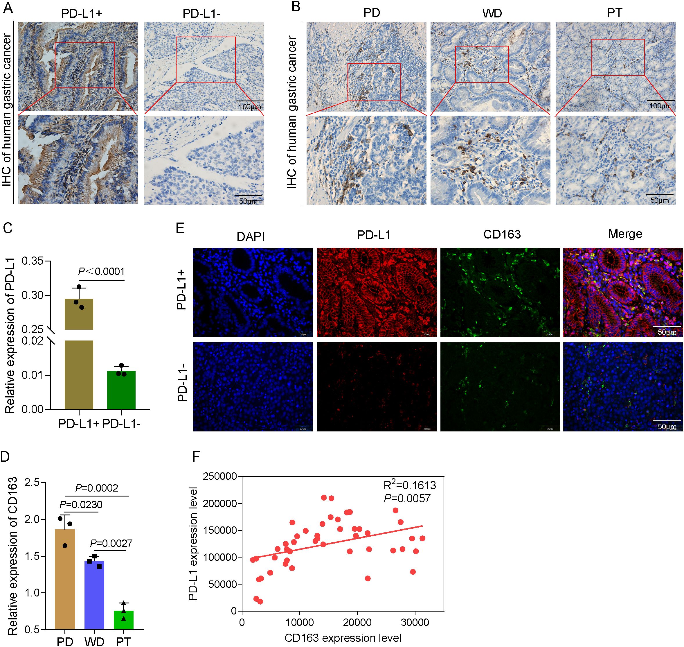 Figure 6. Differentiated gastric cancer (GC) express programmed death-ligand 1 (PD-L1) and CD163 at varying levels. (A) Representative immunohistochemical images of human GC tissues. Scale bars, 50 and 100 μm. (B) Representative immunohistochemical images of poorly differentiated (PD) GC, well-differentiated (WD) GC, and paracancerous tissues (PT). (C) Quantitative analysis of the relative PD-L1 expression. (D) Quantitative analysis of the relative CD163 expression. (E) Immunofluorescence to detect PD-L1 and CD163 expression in several types of differentiated GC. (F) Analysis of the correlation between PD-L1 and CD163 expression levels. Data are presented as the mean ± SEM, and exact p-values are shown in the figure panels.