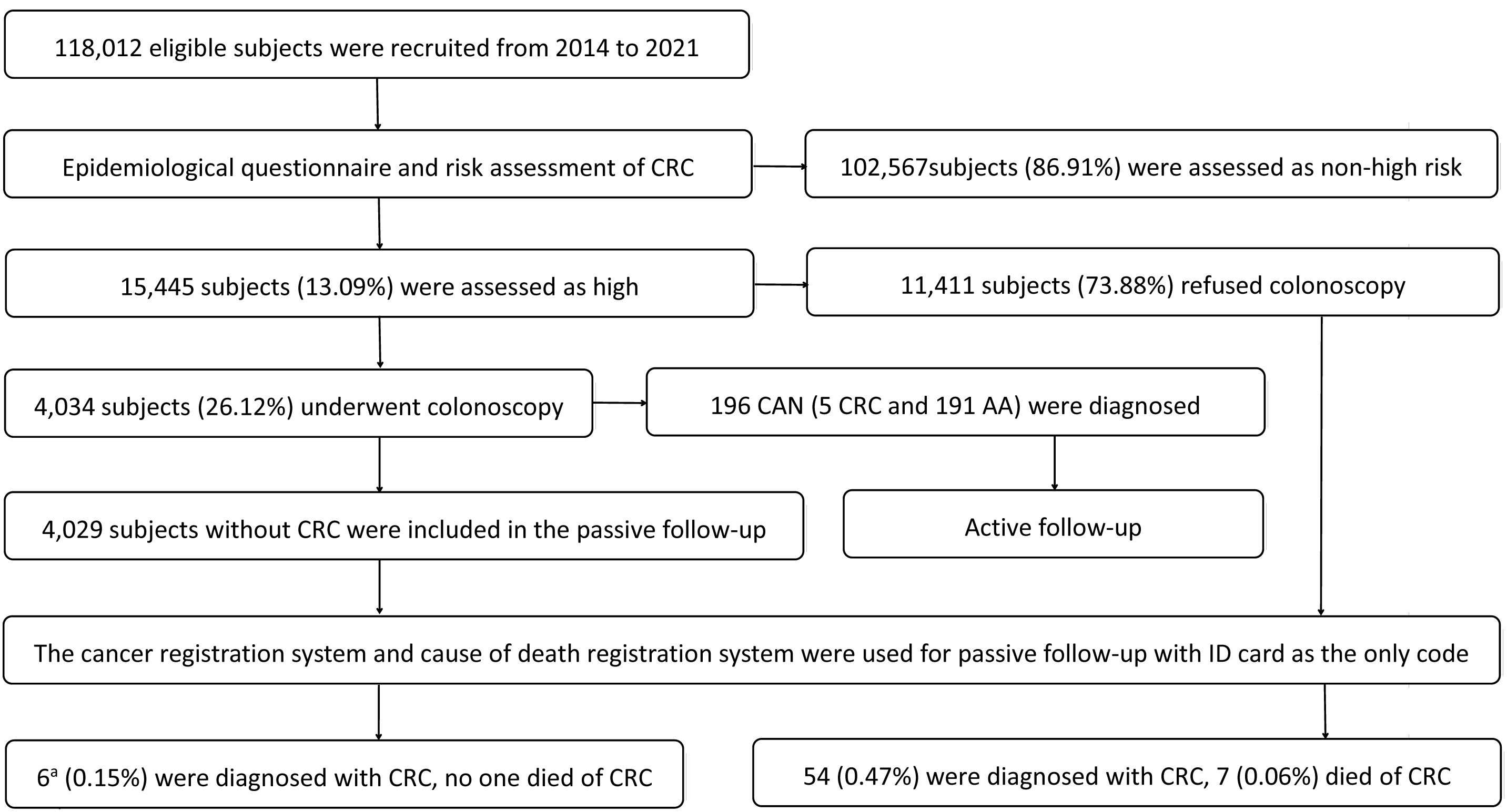 Figure 1. Recruitment and follow-up flow chart. CRC: colorectal cancer; CAN: colorectal advanced neoplasm; AA: advanced adenoma. a5 case detected by colonoscopy screening at baseline was not included.