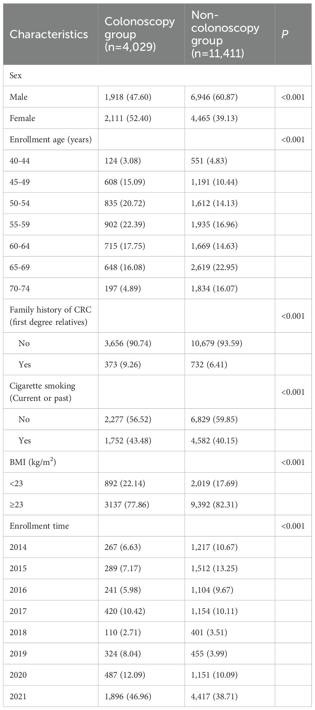 The study population, recruited from July 2014 to December 2021, was divided into two cohorts based on baseline screening results. The active follow-up cohort included 196 participants who screened positive for CAN, and their baseline characteristics are presented in Supplementary Table S1. The passive follow-up cohort included 15,440 participants who were free of CRC at baseline. This cohort was further subdivided into a colonoscopy group (4,029; 26.10%) and a non-colonoscopy group (11,411; 73.90%). The comparative baseline characteristics of these two groups are detailed in Table 1, which shows statistically significant differences in all measures (P < 0.001).