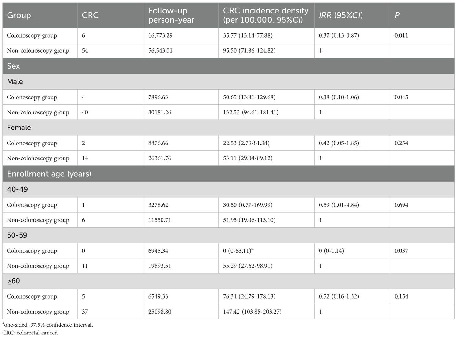 Table 2. The CRC incidence density in each group.