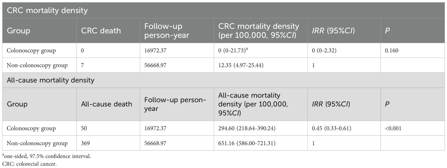 The incidence and mortality densities for the colonoscopy and non-colonoscopy groups were calculated separately. The CRC incidence density, CRC mortality density, and all-cause mortality density were each calculated according to the formula: Density = (Number of events/Total person-years) × 100,000, where “events” corresponds to new CRC cases, deaths from CRC, and deaths from any cause, respectively.