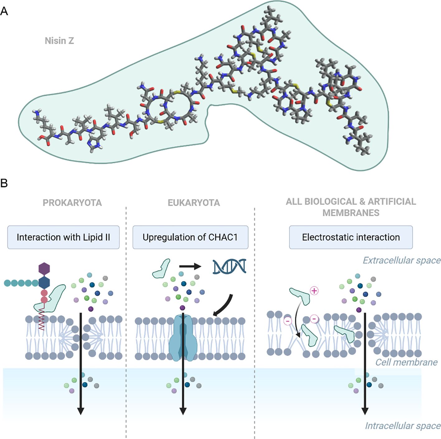 Figure 1. (A) Chemical structure of nisin Z (PubChem CID: 155489899), visualized using Avogadro software. (B) Representative mechanisms of nisin impact on membrane permeability found in various models: i) binding to Lipid II and assembling transmembrane pores (Prokaryota); ii) upregulation of CHAC1, disrupting redox and ion balance (Eukaryota), iii) electrostatic interactions destabilizing lipid bilayers, increasing permeability (found in biological and artificial membranes). Created in https://BioRender.com.
