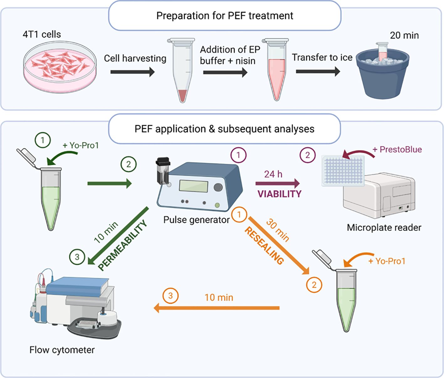 Figure 2. Schematic representation of the experimental workflow. 4T1 cells were incubated with or without nisin Z, subjected to pulsed electric field (PEF) treatment, and subsequently analyzed for membrane permeability, resealing, and viability. Flow cytometry and metabolic assays were used to assess treatment effects at defined time points. Created in https://BioRender.com.