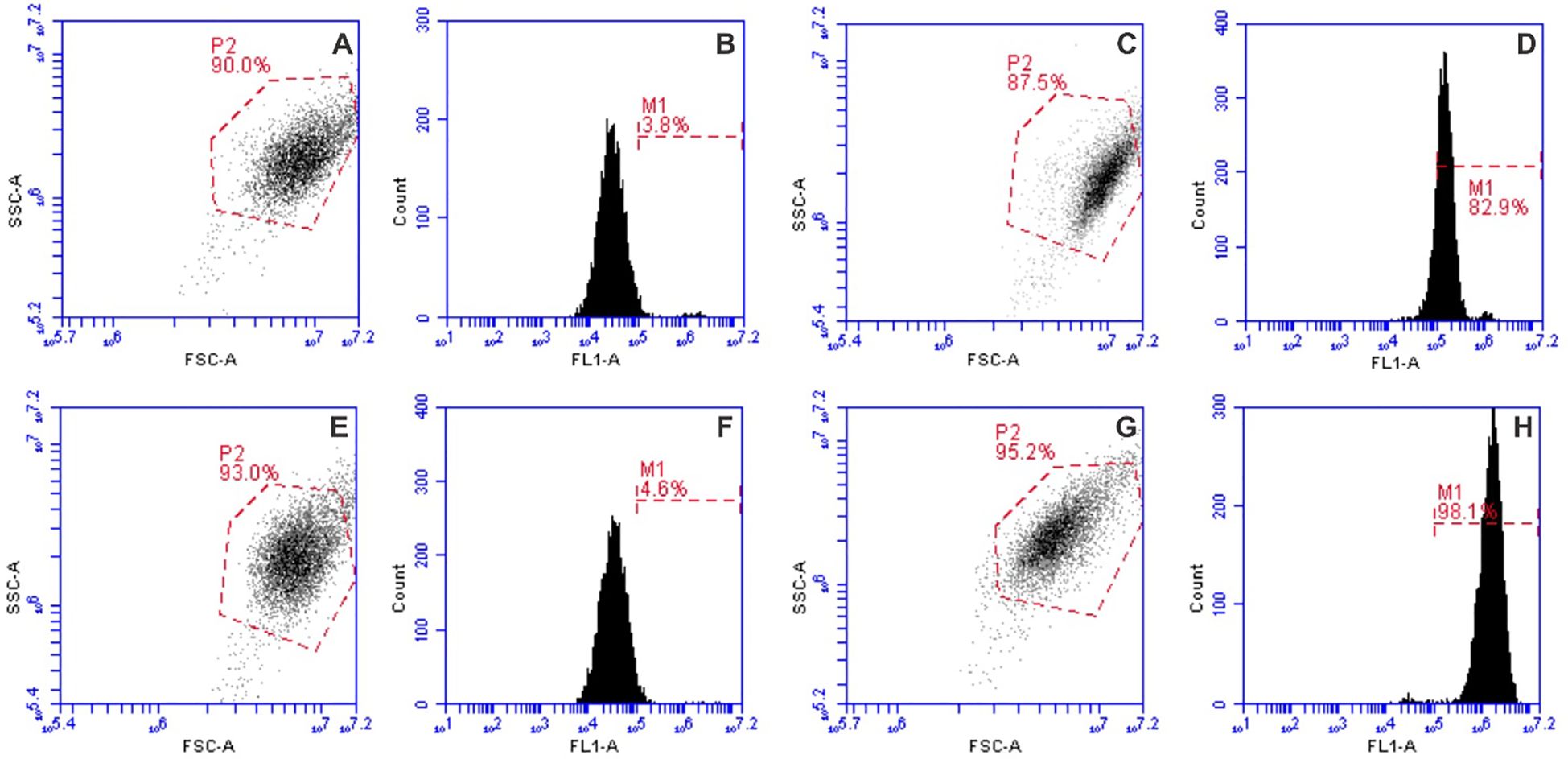 Figure 3. Flow cytometry gating strategy of YP dye, where (A, B) and (C, D) graph pairs are the untreated control and 1.2 kV/cm × 100 µs × 8 electroporation protocol, respectively; (E, F) and (G, H) graph pairs are the nisin-treated and 1.2 kV/cm × 100 µs × 8 electroporation protocol with nisin, respectively.