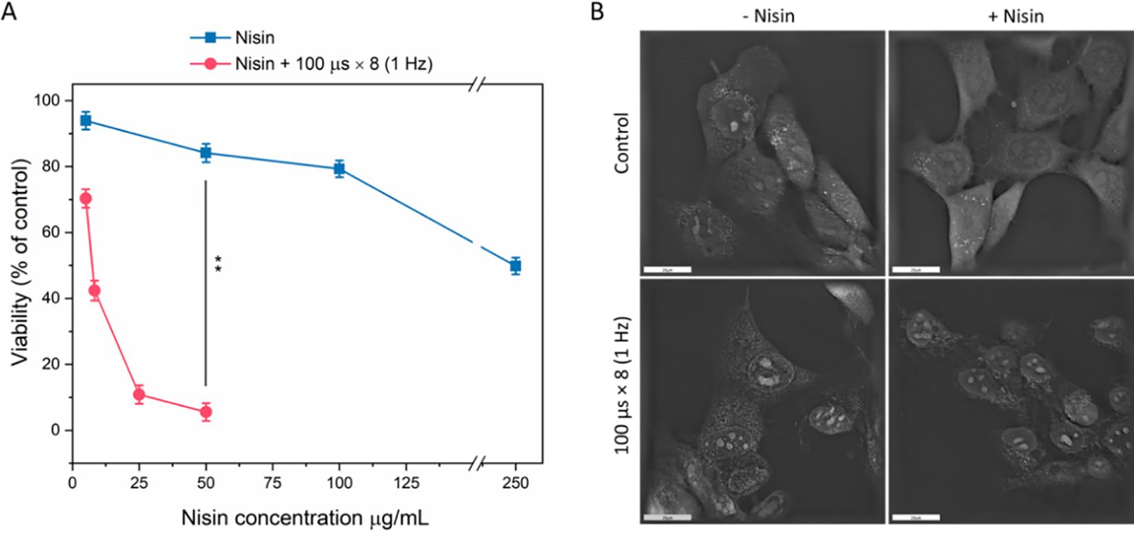 Figure 4. Cell viability (A) and morphology (B) after treatment with nisin Z alone or combined with pulsed electric field (PEF: 1.2 kV/cm, 8 pulses, 100 µs, 1 Hz). Viability (% of control) was assessed following exposure to increasing nisin Z concentrations (0–250 µg/mL), with (red circles) or without (blue squares) PEF. Data shown as mean ± SD (**p < 0.01). Cell morphology was assessed with holotomographic microscopy on adherent cells exposed to 50 µg/mL nisin and PEF. Scale bar: 20 µm.