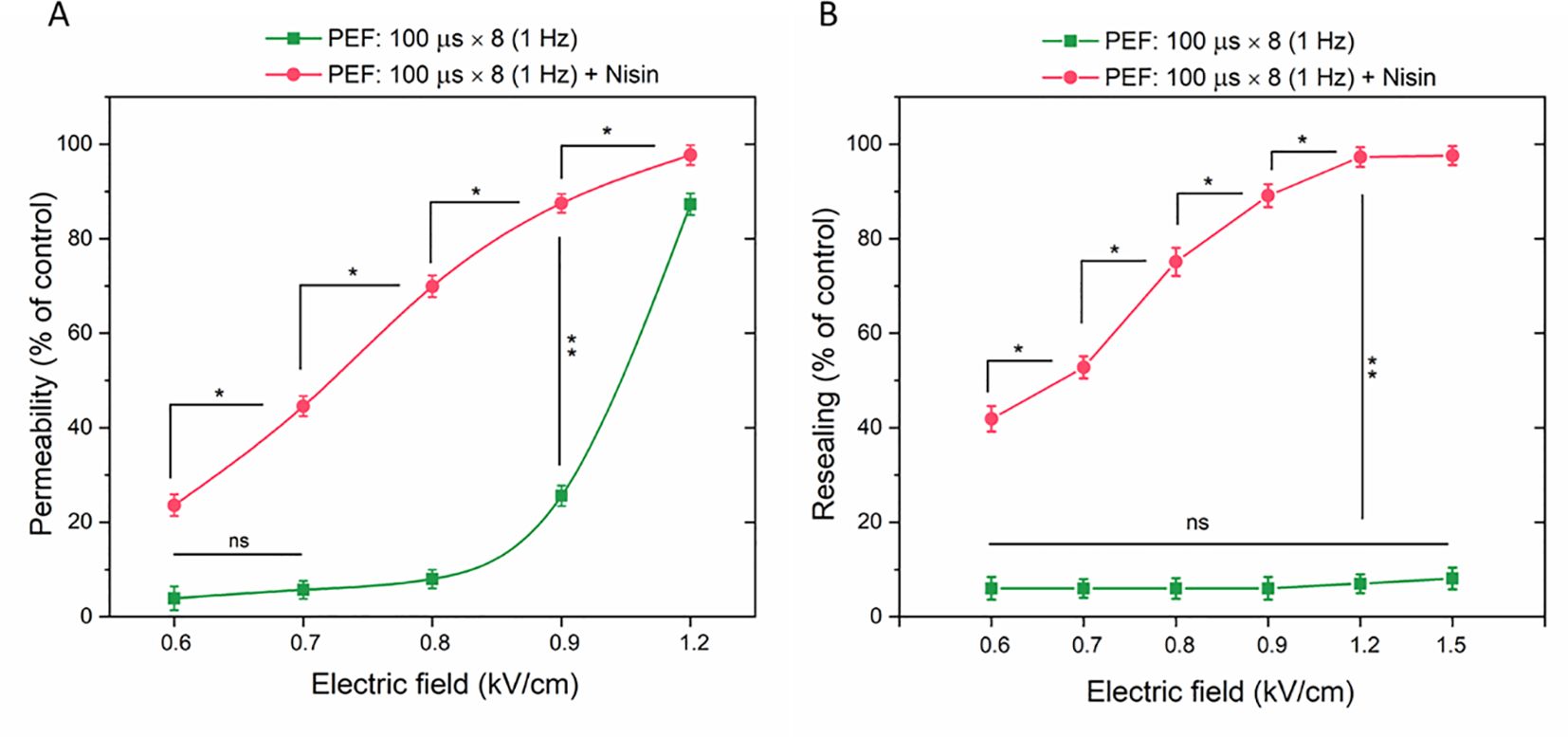 Results: Across all experimental conditions, nisin reduced the threshold voltage necessary for effective permeabilization and increased treatment-induced cell mortality.