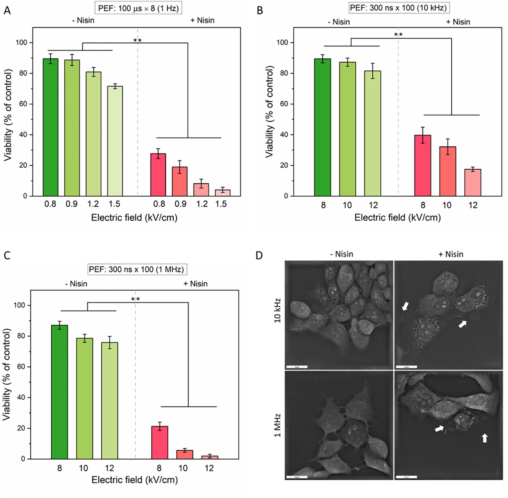 Figure 7. The effect of pulsed electric fields (PEFs) with or without nisin on cell viability (A–C) and morphology (D). Cells were exposed to increasing electric field strengths under three different pulse conditions: (A) Microsecond pulses: 100 μs × 8 at 1 Hz; (B) Nanosecond pulses (nsPEF): 300 ns × 100 at 10 kHz; (C) Nanosecond pulses: 300 ns × 100 at 1 MHz. Data shown as mean ± SD (**p< 0.01). Cell morphology was assessed with holotomographic microscopy on adherent cells exposed to 50 µg/mL nisin and nsPEF (8 kV/cm, 300 ns × 100 at 10 kHz or 1 MHz). Cell blebbing was marked with white arrows. Scale bar: 20 µm.