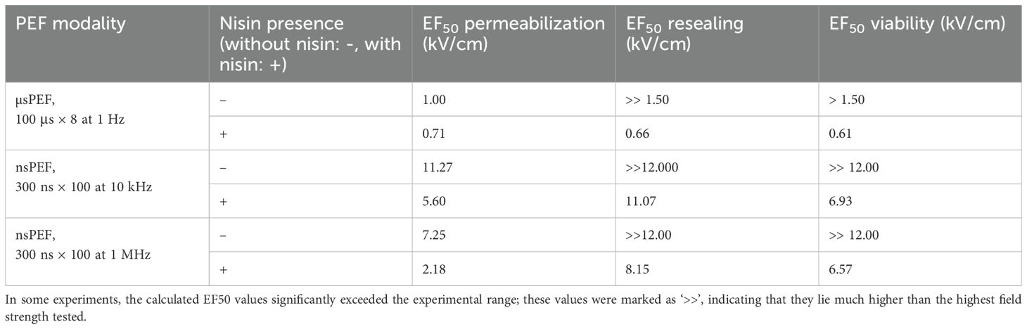 Table 1. EF50 values (electric field strength required to affect 50% of cells) for membrane permeabilization, resealing, and viability under different pulsed electric field (PEF) modalities, with and without the presence of nisin.