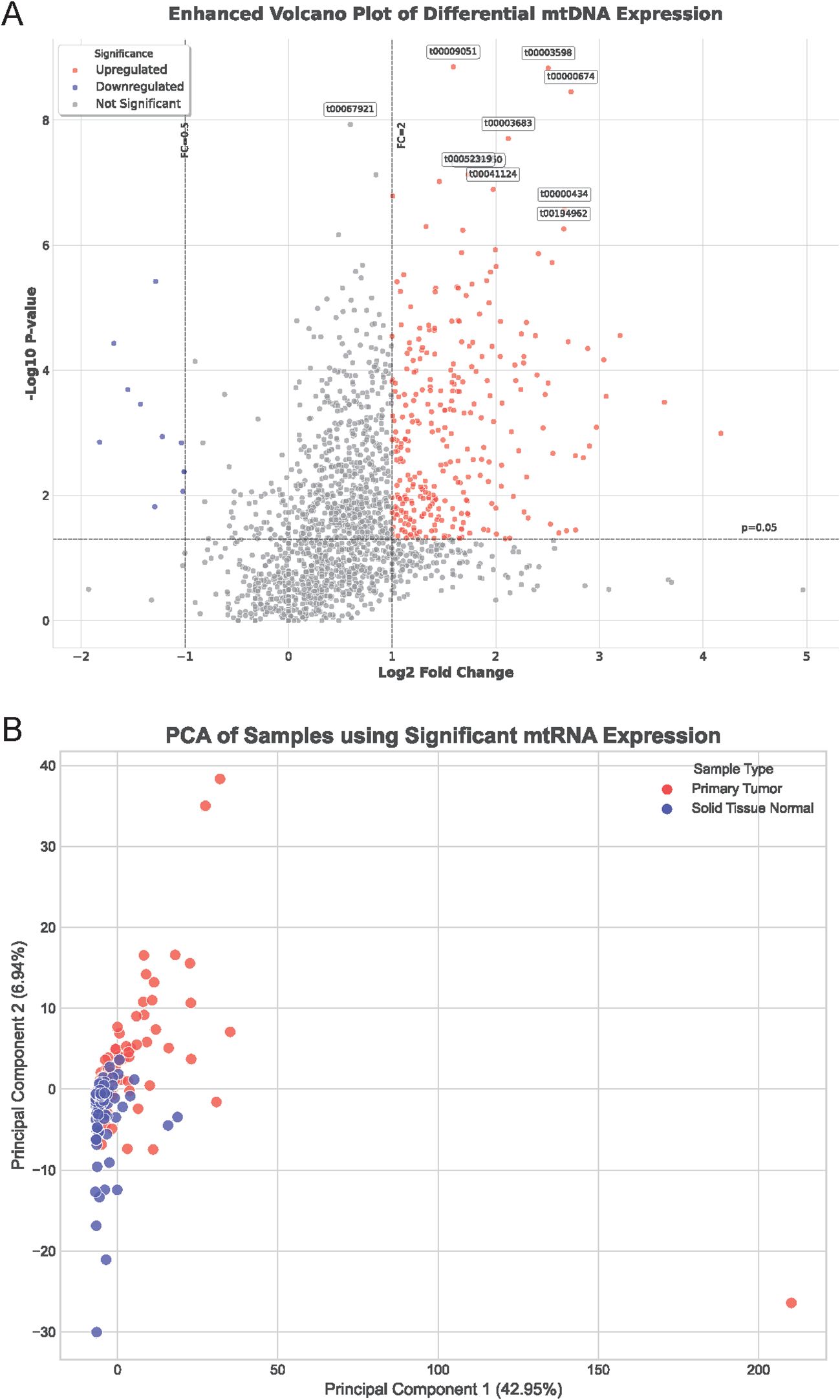 Figure 1. Differential expression analysis of mitochondrial non-coding RNAs in lung cancer. (A) Enhanced volcano plot displaying the distribution of mtRNAs based on fold change (x-axis) and statistical significance (-log10 P-value, y-axis) between lung cancer and normal tissue samples. Red dots represent significantly upregulated mtRNAs, blue dots indicate significantly downregulated mtRNAs, and gray dots show non-significant changes. Horizontal dashed line indicates P = 0.01 threshold, vertical dashed lines represent |log2FC| = 1 cutoffs. Selected mtRNAs with highest significance are labeled with their identifiers. (B) Principal Component Analysis (PCA) plot showing sample clustering based on significantly dysregulated mtRNA expression profiles. Red dots represent primary tumor samples; blue dots indicate solid tissue normal samples. PC1 explains 42.95% of total variance, PC2 explains 6.84% of total variance, demonstrating clear separation between cancer and normal tissue groups.
