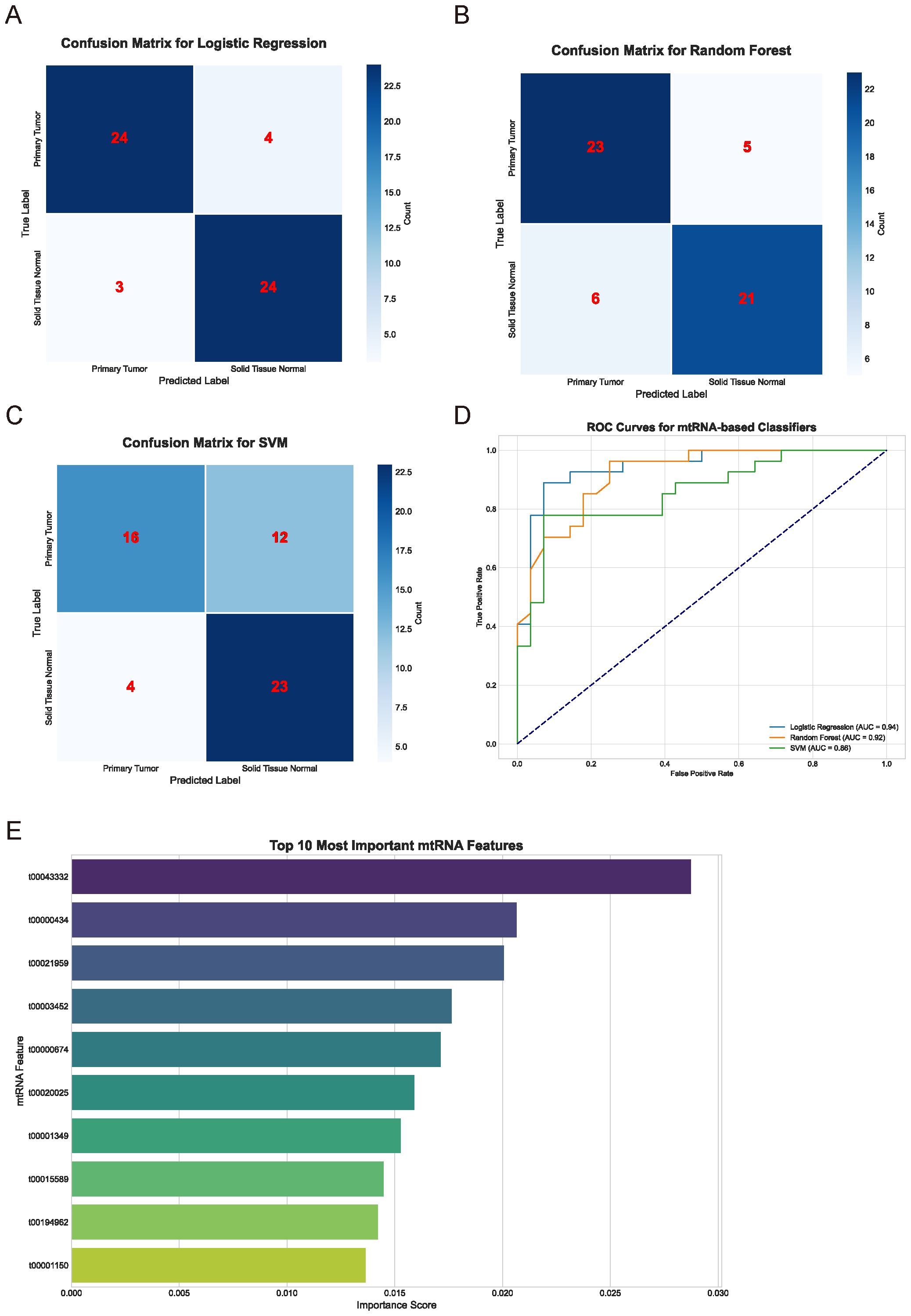 (A) Confusion matrix for logistic regression showing predicted vs. true labels for primary tumor and solid tissue normal. (B) Confusion matrix for random forest with similar label distributions. (C) Confusion matrix for SVM highlighting discrepancies in predictions. (D) ROC curves for mtRNA-based classifiers depicting performance of logistic regression, random forest, and SVM with respective AUC scores. (E) Bar chart illustrating the top ten most important mtRNA features ranked by importance score.
