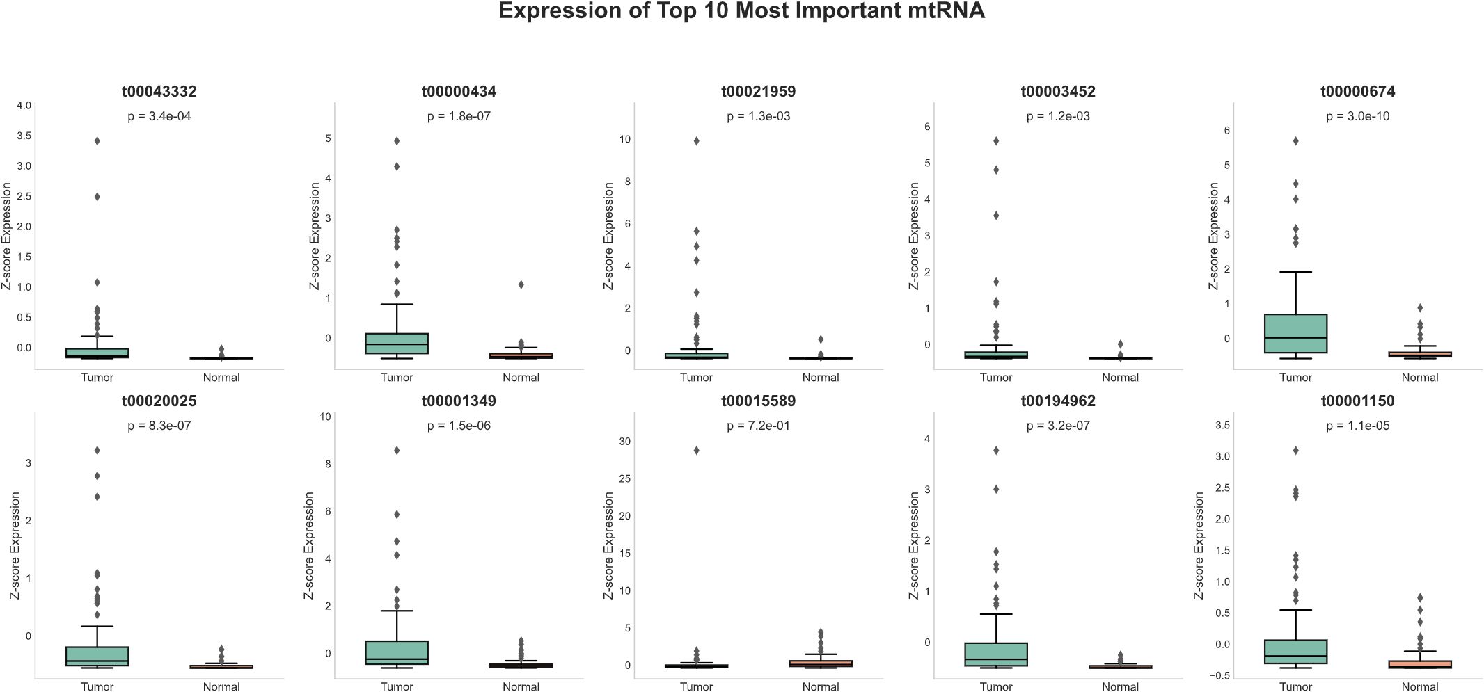 Boxplot showing the expression of the top ten most important mtRNA between tumor and normal samples. Each panel displays a different mtRNA with significant differences in Z-score expression. Tumor samples consistently exhibit higher expression than normal samples, as indicated by the p-values below each mtRNA identifier.