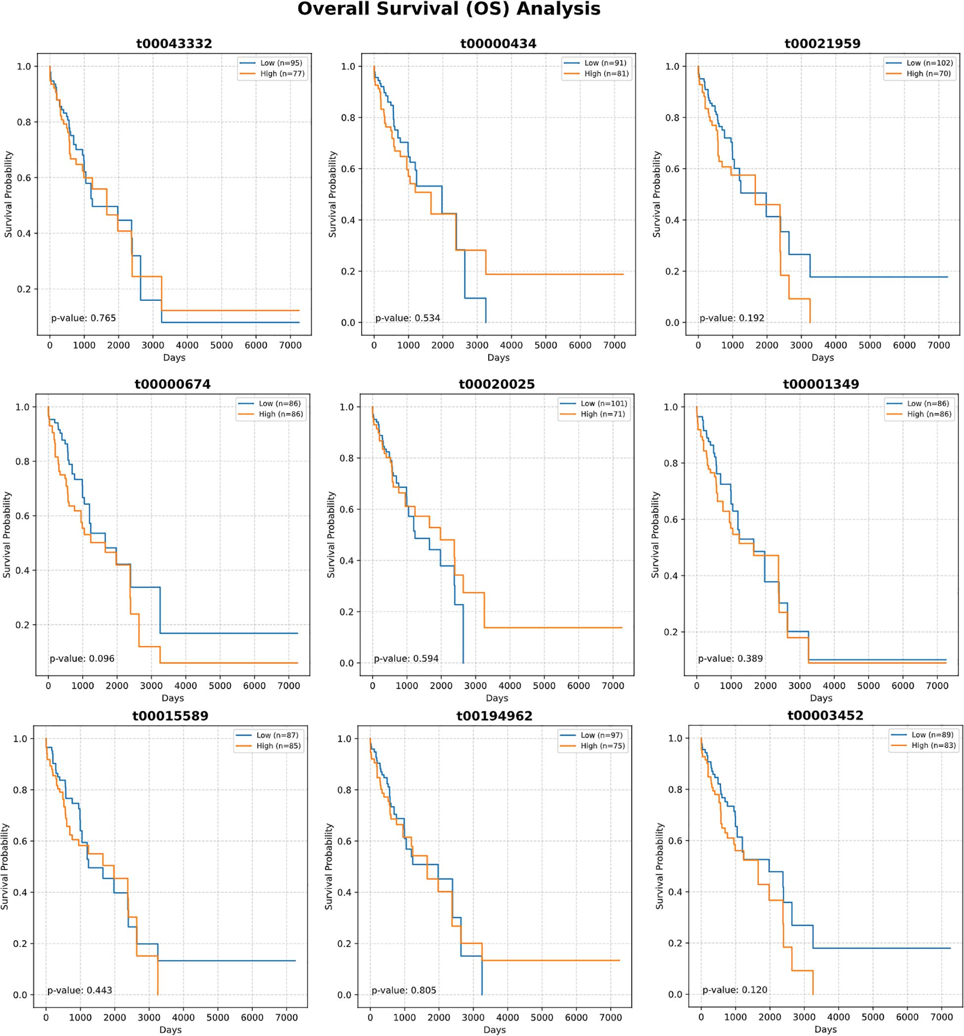 Nine Kaplan-Meier survival plots labeled t00043332, t00000434, t00021959, t00000674, t00002025, t00001349, t00015589, t00194962, and t00003452 analyze overall survival (OS). Each plot compares low and high groups, with days on the x-axis and survival probability on the y-axis. P-values accompany each plot, indicating statistical significance levels: 0.765, 0.534, 0.192, 0.096, 0.594, 0.389, 0.443, 0.805, and 0.120 respectively.