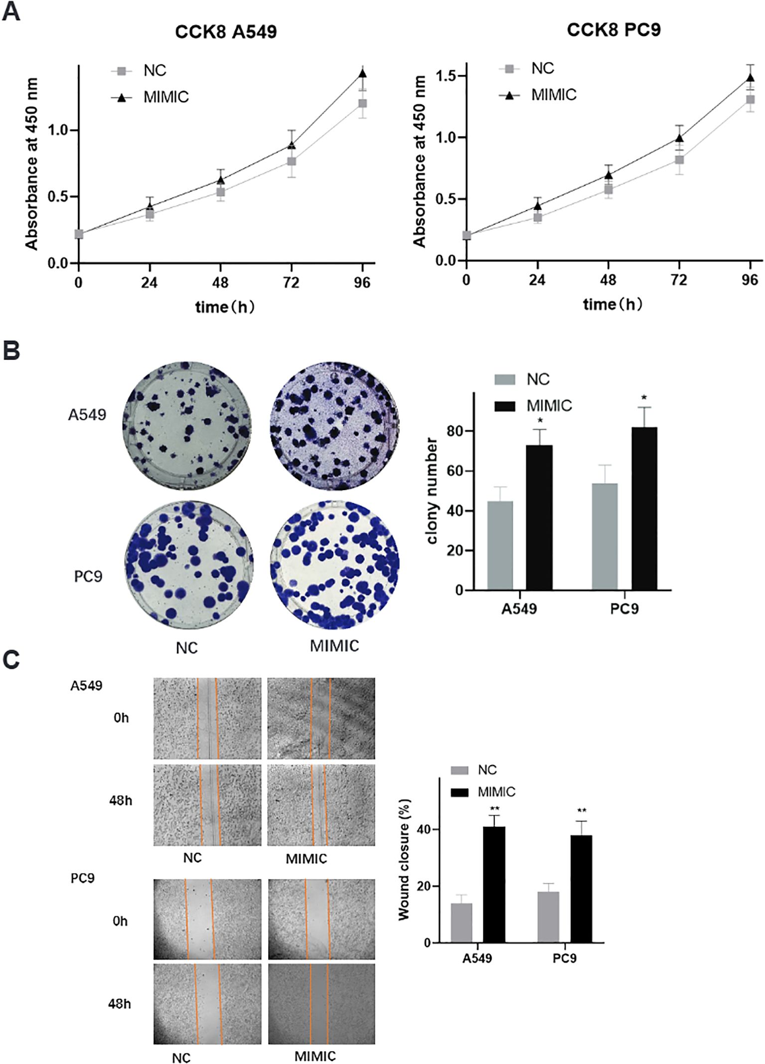 Panel A shows line graphs comparing absorbance at 450 nm over 96 hours for A549 and PC9 cells under NC and MIMIC conditions. Panel B includes images of colonies formed by A549 and PC9 cells, with a bar graph showing increased colony numbers under MIMIC conditions. Panel C features wound healing assay images at 0 and 48 hours for both cell lines, with a bar graph indicating higher wound closure percentages in MIMIC-treated cells.