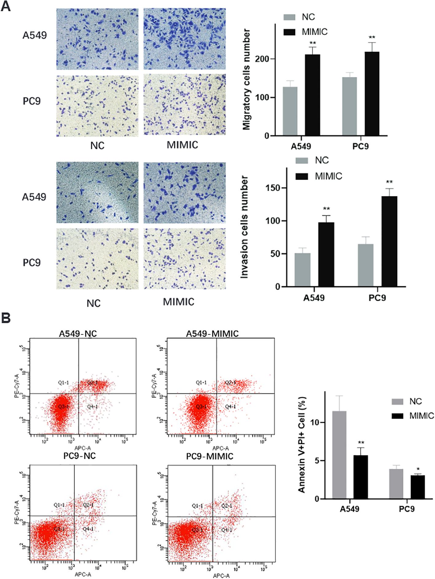 Panel A shows bright-field images of A549 and PC9 cells under NC and MIMIC conditions, with bar graphs displaying migratory and invasive cell numbers. MIMIC increases both migration and invasion. Panel B displays flow cytometry dot plots for A549 and PC9 cells with NC and MIMIC, indicating reduced Annexin V-positive and PI-positive cells under MIMIC. A bar graph quantifies these reductions.