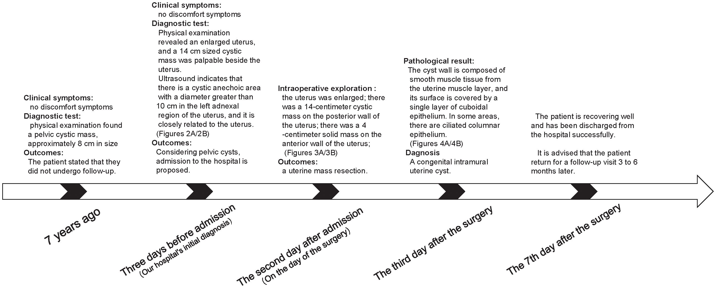 The patient is a 51-year-old woman with regular menstruation. She reported that a pelvic cystic mass, approximately 8 cm in size, was detected during a physical examination 7 years ago. Previous medical reports from prior visits are missing, with specific details unknown, and she did not receive regular follow-up visits (Figure 1). She came to our hospital for a physical examination 3 days ago; on examination, the uterus was enlarged to the size of an 8-week pregnancy, and a 14-cm cystic mass was palpable adjacent to the uterus, with good mobility, close relation to the uterus, and no tenderness or discomfort. Gynecological ultrasound in the patient showed the following findings: (1) The anterior myometrium of the uterus presented with coarsened and enhanced echoes, with a heterogeneous echo area measuring approximately 4.9 × 4.8 cm, featuring ill-defined borders and no capsule noted. (2) A 14.1 × 9.7 cm cystic anechoic lesion was observed in the left adnexal region of the uterus, which was thick-walled with poor sound transmission and showed deposition of medium-echoic spots. This anechoic space-occupying lesion was closely related to the uterus. Ultrasound-based diagnostic considerations were as follows: (1) uterine adenomyoma and (2) cystic space-occupying lesion in the left adnexal region (O-RADS category: 3) (Figures 2A, B). Routine auxiliary examinations showed no abnormalities. Since the onset of the condition, the patient has had no discomforts such as increased menstrual flow, abdominal pain, abdominal distension, frequent urination, or constipation.