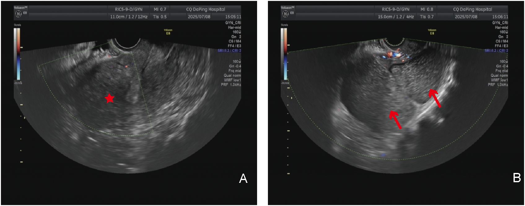 Figure 2. Imaging examination: (A) Transvaginal ultrasound examination; the red asterisk indicates the uterus. (B) Transvaginal ultrasound examination; the red arrow shows the giant cyst of the uterus.
