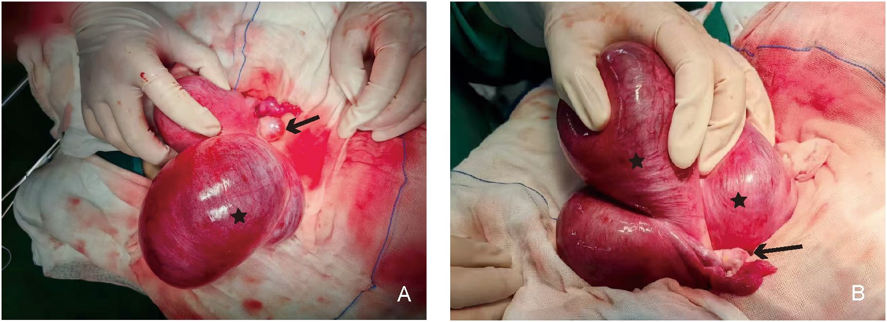 Figure 3. Gross specimen showing the relationship between the uterine cyst and the uterus. (A) Structural view of the anterior side of the uterine cyst: the black asterisk indicates the uterine cyst on the left side of the uterus, and the black arrow indicates the left ovary and fallopian tube. (B) Structural view of the posterior side of the uterine cyst: the black asterisk indicates the uterine cyst on the left side of the uterus, and the black arrow indicates the left ovary and fallopian tube.