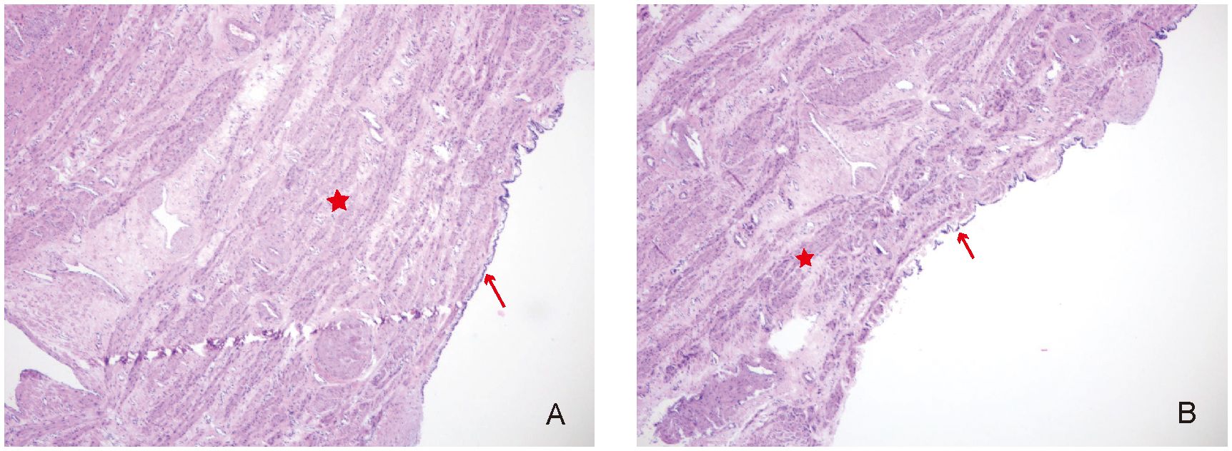 Figure 4. (A, B) Pathological examination of the uterus cyst (“H&E,×40”). The red asterisk shows the smooth muscle tissue, and the red arrow indicates cuboidal or columnar epithelium.