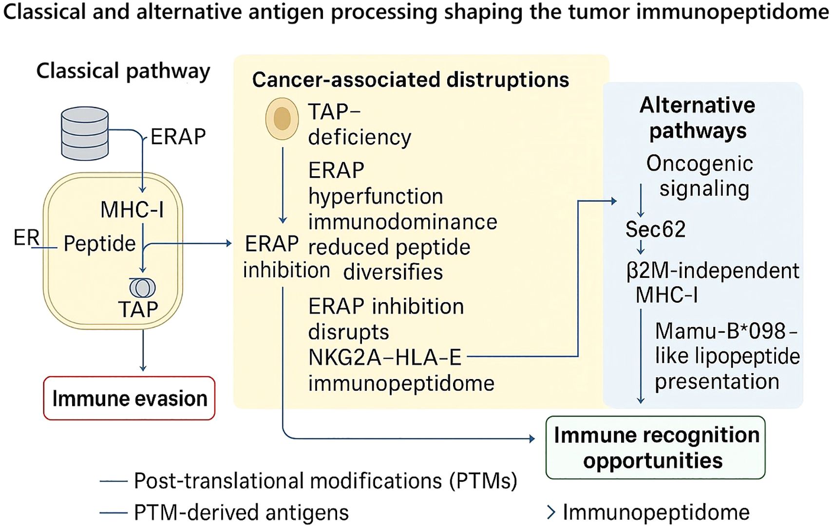 Figure 1. Classical and alternative antigen processing pathways shaping the tumor immunopeptidome. In the canonical pathway (left), peptides generated by the proteasome are transported into the endoplasmic reticulum (ER) via TAP and further trimmed by ERAP1/2 before loading onto MHC-I molecules for surface presentation. Tumor cells frequently disrupt this cascade (center): loss of TAP expression reduces peptide import and MHC-I stability, while ERAP1 hyperfunction drives immunodominance and reduced peptide diversity. Conversely, ERAP1 inhibition can diversify the peptide repertoire and abolish the NKG2A–HLA-E checkpoint, thereby restoring immune recognition. Alternative pathways (right) highlight the plasticity of antigen presentation in cancer: oncogenic signaling generates post-translationally modified (PTM) peptides; Sec62-dependent transport sustains peptide entry into the ER even in TAP-deficient settings; β2M-independent heavy chain binding enables residual recognition; and Mamu-B*098-like allomorphs mediate TAP-independent lipopeptide presentation. Collectively, these mechanisms illustrate how tumors both evade and expose themselves to immune detection, positioning ERAP1/2 modulation, TAP2-focused targeting, and PTM epitope exploitation as promising therapeutic strategies.