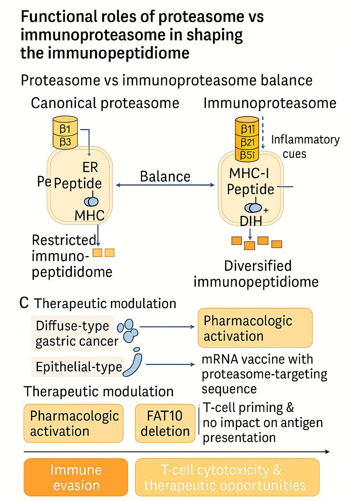 Figure 2. Functional interplay between constitutive proteasomes and immunoproteasomes shapes the tumor immunopeptidome. Inflammatory cues induce immunoproteasome subunits (β1i, β2i, β5i), diversifying antigen presentation, whereas lineage-specific architectures (e.g., diffuse-type gastric cancer) and therapeutic interventions (pharmacologic activation, mRNA vaccines, FAT10 deletion) variably reprogram peptide repertoires. Together, these mechanisms dictate immune evasion versus enhanced T-cell cytotoxicity and therapeutic opportunities.