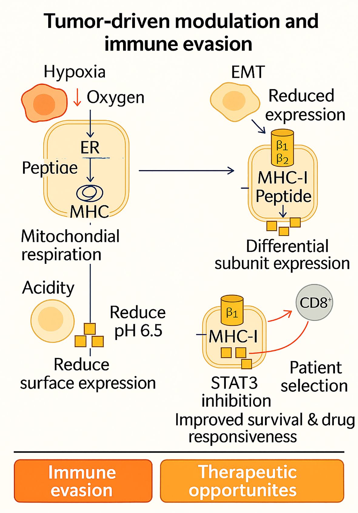 Figure 3. Tumor-driven modulation of antigen processing illustrates how hypoxia, EMT, acidity, and subunit-specific changes in the tumor microenvironment converge to downregulate MHC-I presentation and promote immune evasion. Yet, each of these adaptive strategies simultaneously reveals therapeutic vulnerabilities ranging from hypoxia-targeting and IFN-γ/epigenetic restoration to STAT3 inhibition and β5i-based patient stratification highlighting the immunoproteasome as both a barrier and an opportunity in cancer immunotherapy.