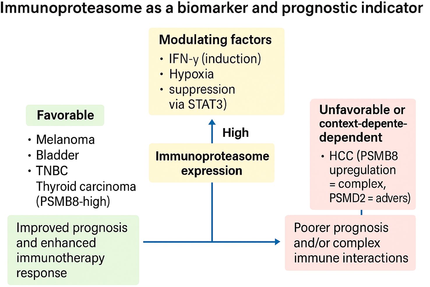 Figure 4. Immunoproteasome expression as a context-dependent biomarker of prognosis and immunotherapy response. High immunoproteasome (IP) expression can stratify tumors into favorable or unfavorable prognostic categories depending on tumor type and microenvironmental context. In melanoma, bladder cancer, triple-negative breast cancer (TNBC), and thyroid carcinoma, IP-high states associate with improved prognosis and enhanced response to immune checkpoint blockade. In contrast, in hepatocellular carcinoma (HCC)—particularly with PSMD2 upregulation—and across pan-cancer settings dominated by suppressive tumor microenvironments, IP expression may coincide with poorer outcomes or complex immune interactions. Modulating factors such as IFN-γ (inductive), hypoxia (suppressive), and extracellular acidity (suppressive via STAT3) dynamically influence IP activity and thereby its predictive value. Collectively, these findings underscore the immunoproteasome as both a biomarker and a barometer of immune readiness, with therapeutic implications for patient stratification and combination strategies.