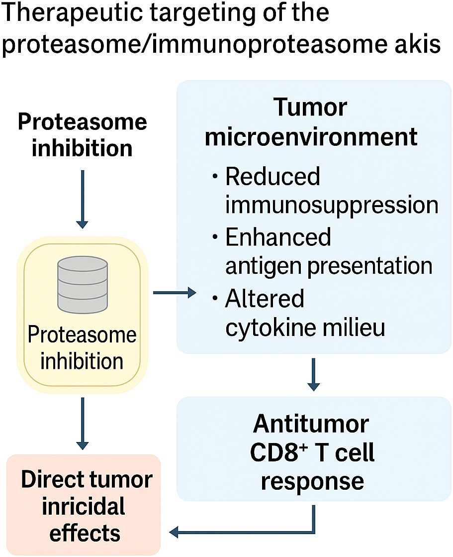 Figure 5. Therapeutic targeting of the proteasome/immunoproteasome axis. Selective inhibition of the proteasome or immunoproteasome exerts dual effects: (i) direct tumoricidal activity through induction of proteotoxic stress and apoptosis, and (ii) reshaping of the tumor microenvironment, characterized by reduced immunosuppression, enhanced antigen presentation, and reprogrammed cytokine milieu. Together, these effects amplify CD8+ T cell–mediated antitumor immunity, positioning the proteasome–immunoproteasome axis as both a cytotoxic target and an immunomodulatory lever in cancer therapy.