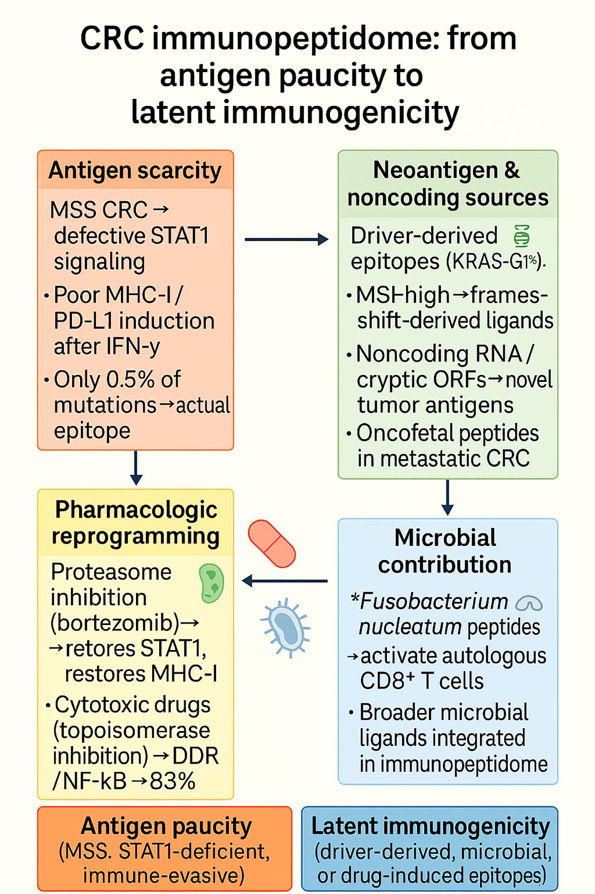 Figure 7. The CRC immunopeptidome is characterized by profound antigen paucity in MSS tumors due to defective STAT1 signaling and poor IFN-γ–induced MHC-I expression, but can be pharmacologically reprogrammed (e.g., by proteasome or cytotoxic drugs) to restore antigen visibility. Beyond this scarcity, latent immunogenicity emerges from driver-derived epitopes (e.g., KRAS-G12V), noncoding ORFs, oncofetal peptides, and microbial ligands such as Fusobacterium nucleatum, highlighting both constraints and opportunities for therapeutic exploitation.